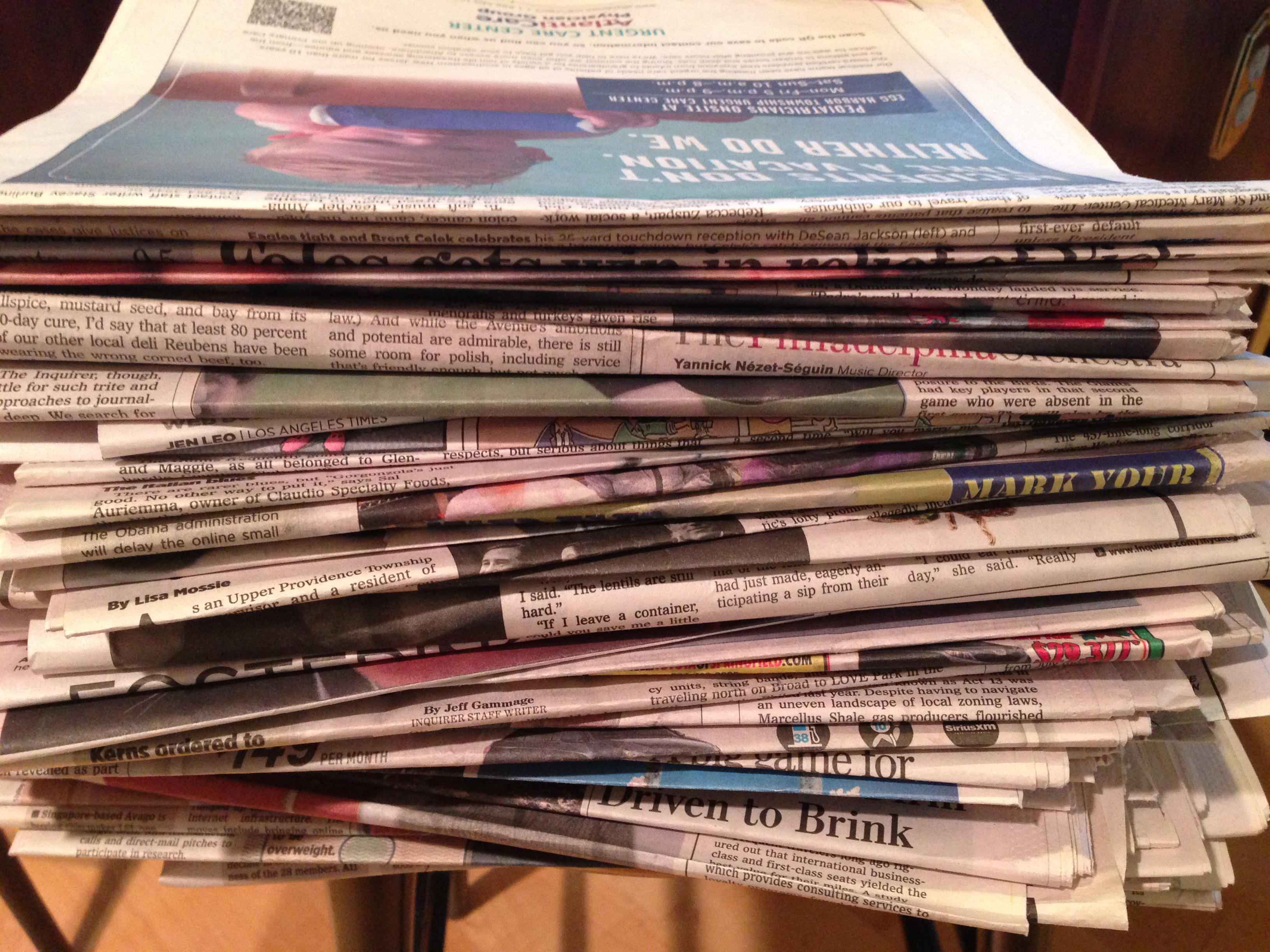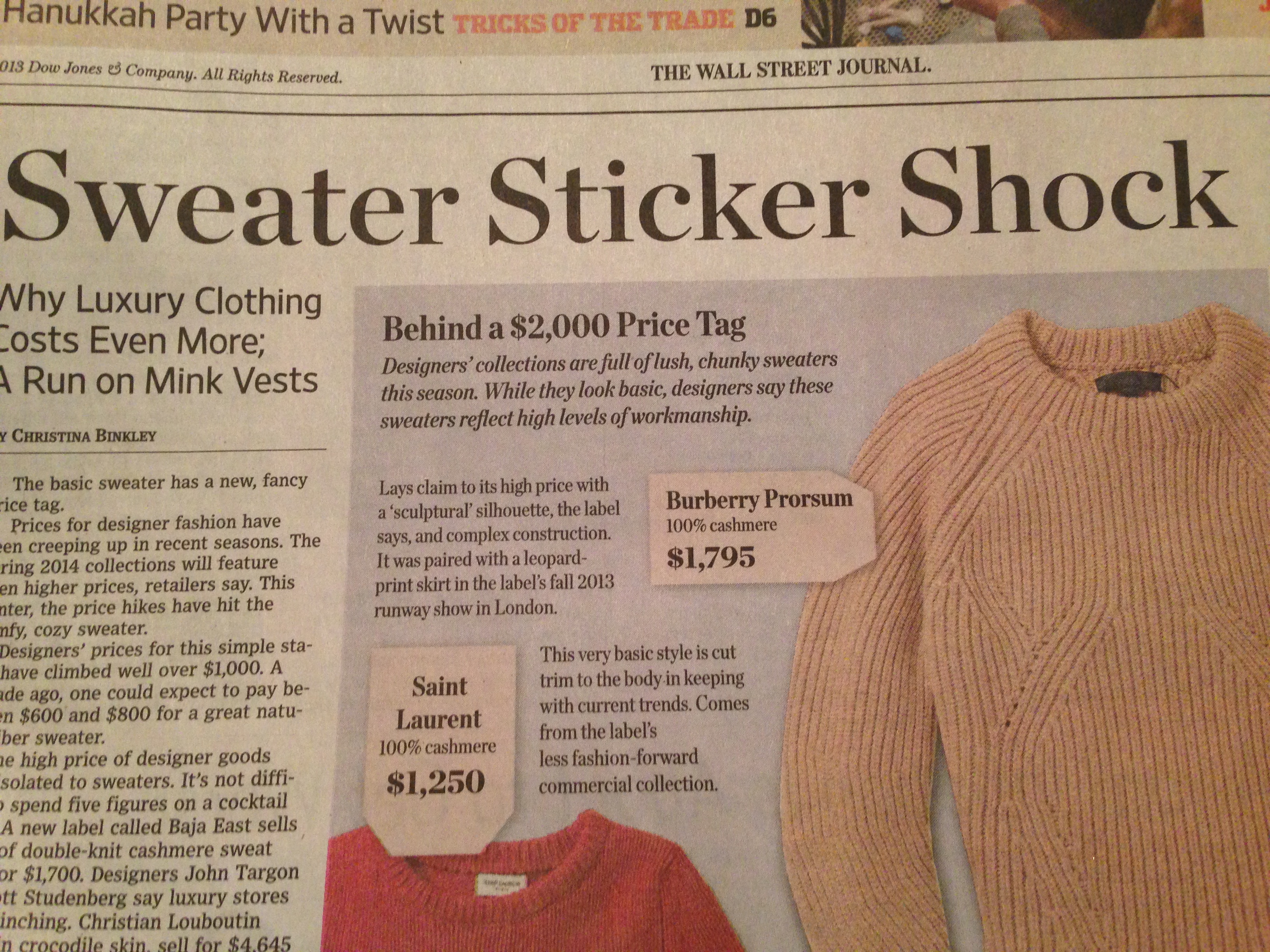 Getting through the newspapers has become a bigger project lately. My husband recently received a subscription to The Wall Street Journal with hotel points, adding to our usual Philadelphia Inquirer subscription. I’m amazed by the different level of spending reflected in its pages. For example, its real estate section is called “Mansions.” The lead-up to the holidays involved the usual lists of gift ideas, but with jaw-dropping prices. I’m definitely not their targeted demographic. And then there was this article on the two thousand dollar sweater. What?!? I know there is no law against charging or spending two thousand dollars for a sweater, but I find it absolutely obscene. Okay, before I start foaming at the mouth, I will let go of this issue and this paper.