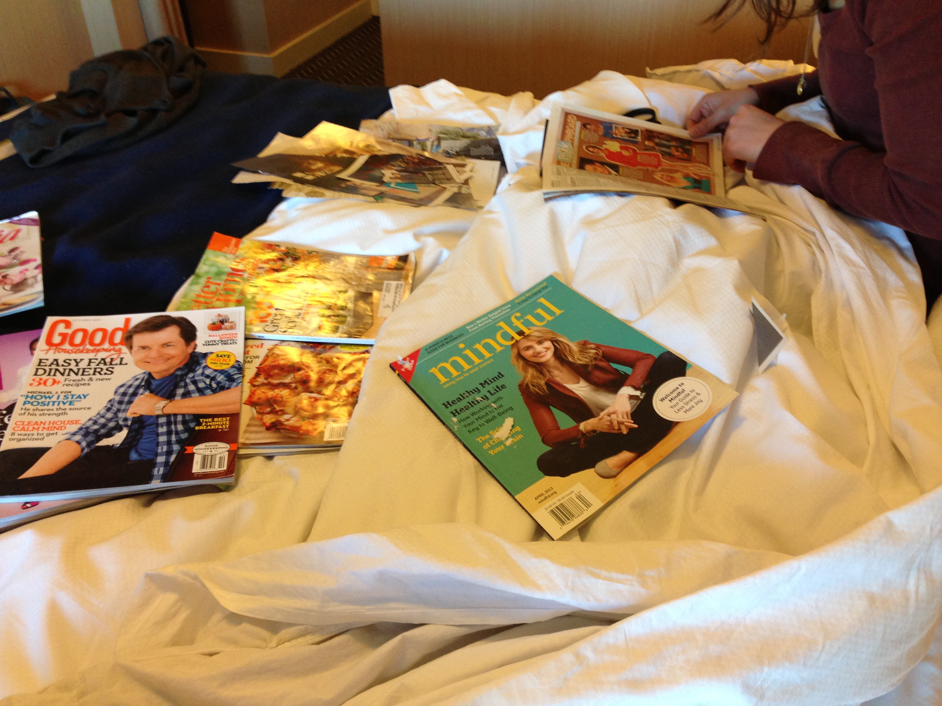 I brought along a ridiculous pile of — heavy — magazines. Talk about excess baggage. My daughter and I had fun collecting images for vision boards while clearing away a big clump. I certainly needed a positive vision to set my mind to. And leaving the discarded remains in a hotel recycling bin was very satisfying.