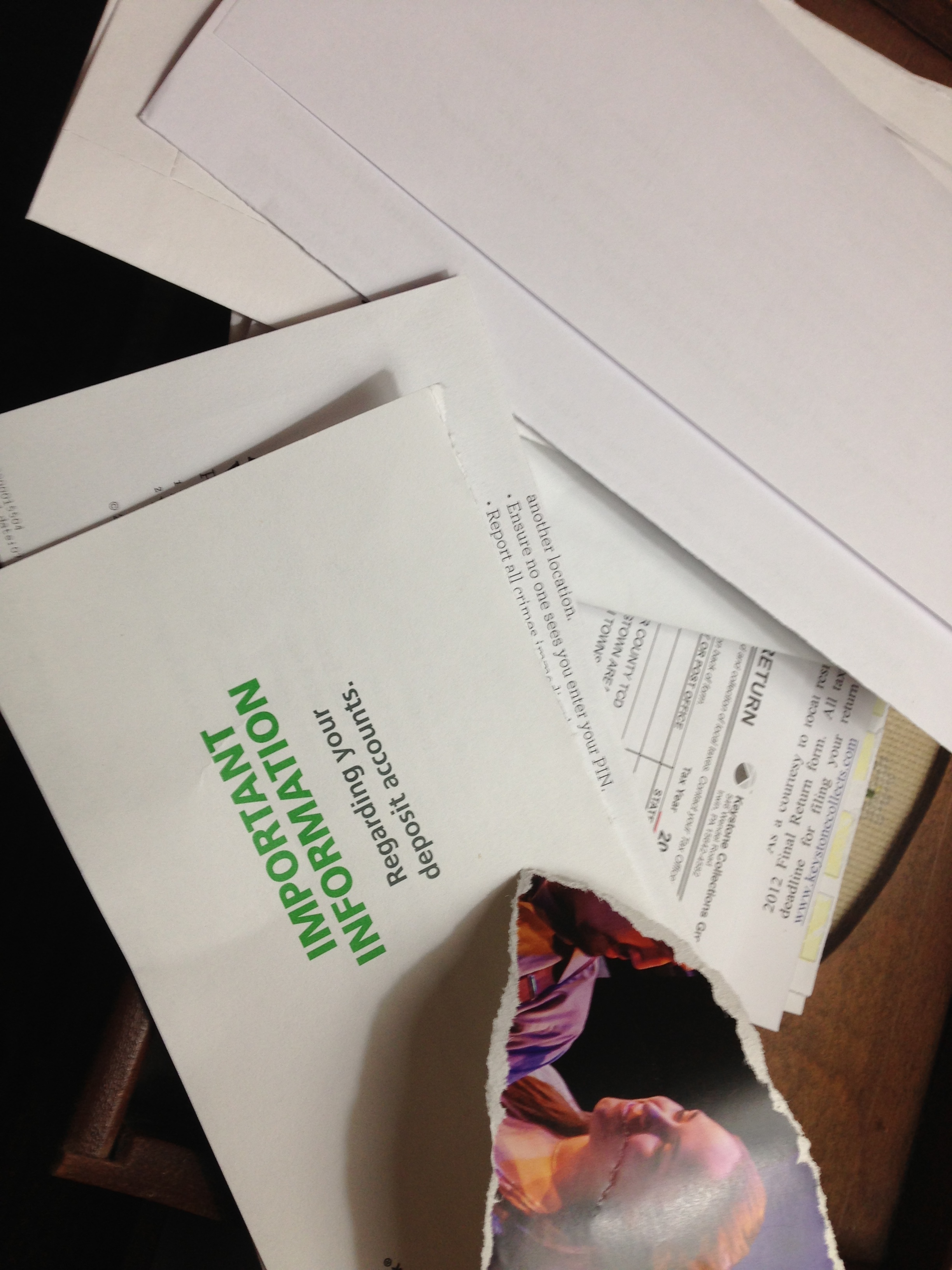 Today’s paper pile was petite. It was a bunch of papers addressed to our older daughter, who no longer lives with us. One ancient newsletter, bank rate notice, and tax forms: easily filed or shredded.
