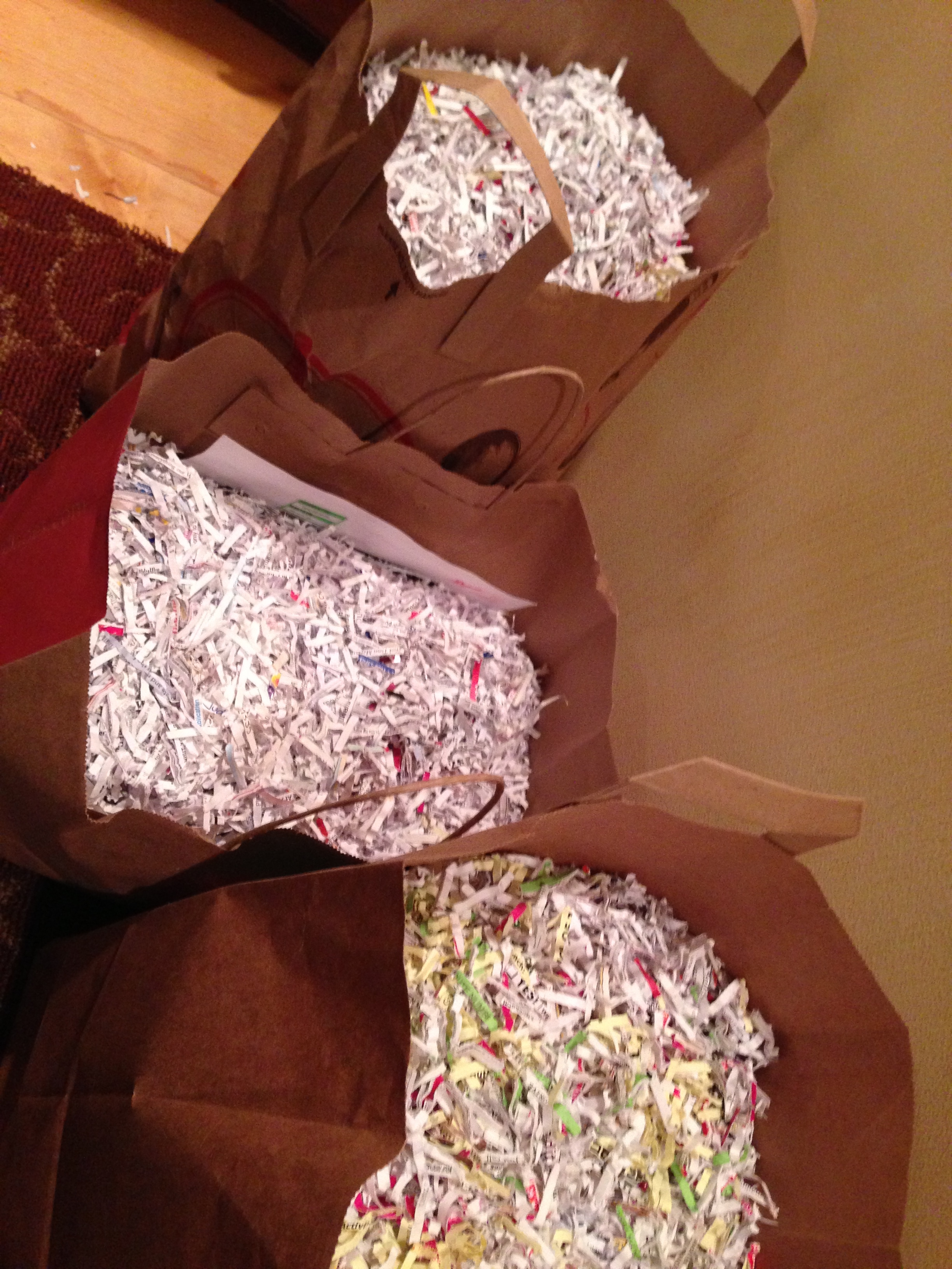 And speaking of shredding, as much as I’ve been marveling at how easy this project is turning out to be (in direct opposition to the dread with which I approached it), the proof is in these bags waiting to be kicked to the curb and picked up by the recycling truck. Mama Mia! That’s a lotta shredding!