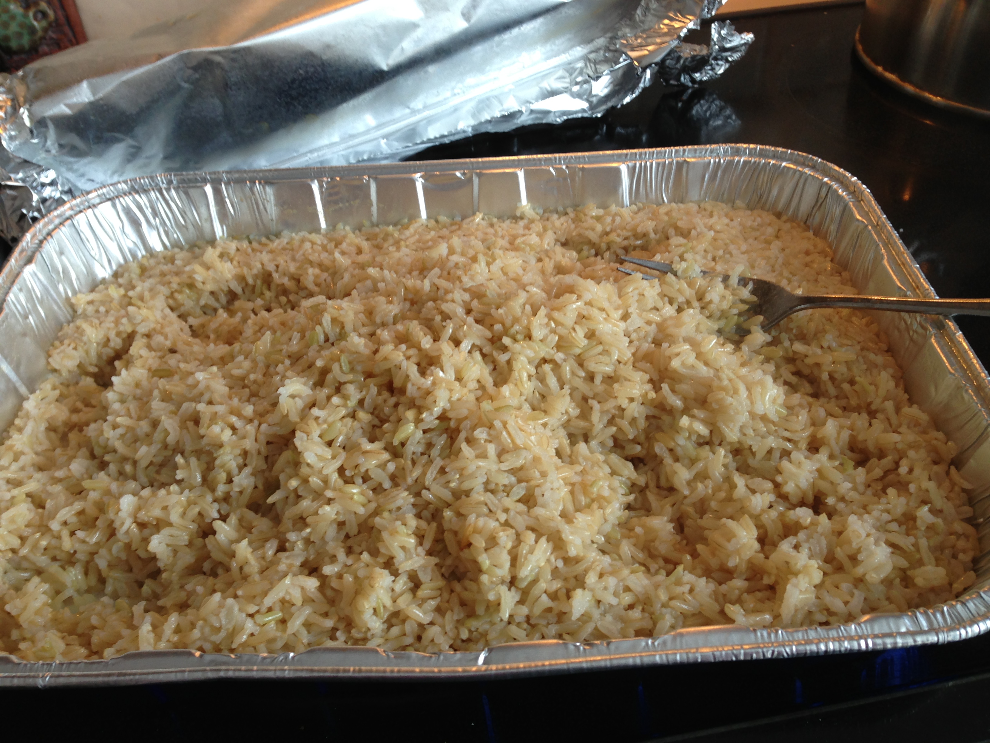 I ended up with this recipe for fool-proof oven-baked brown rice from a blog called One Good Thing by Jillee.  I made myself crazy worrying about whether it would work as well with aluminum foil pans.  And would cooking three pans at one time throw it off?  I had neither the time nor the nine cups of rice to start over again.  In short, I was feeling unworthy to the task.  But it turned out perfectly!  I would highly recommend the method.  One good thing, indeed!