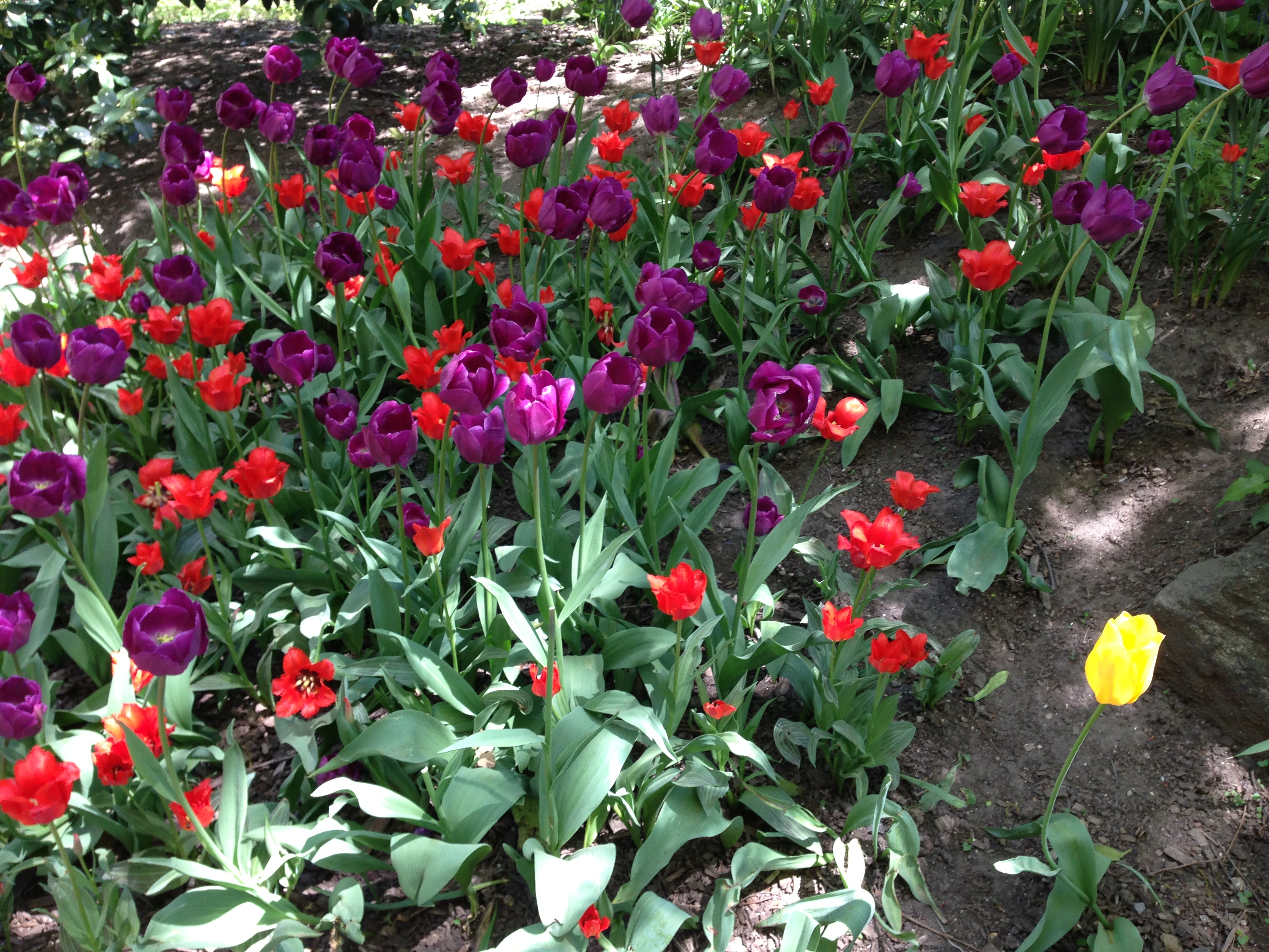 Purple and red tulips in Manhattan ostracizing a lonely yellow blossom:
