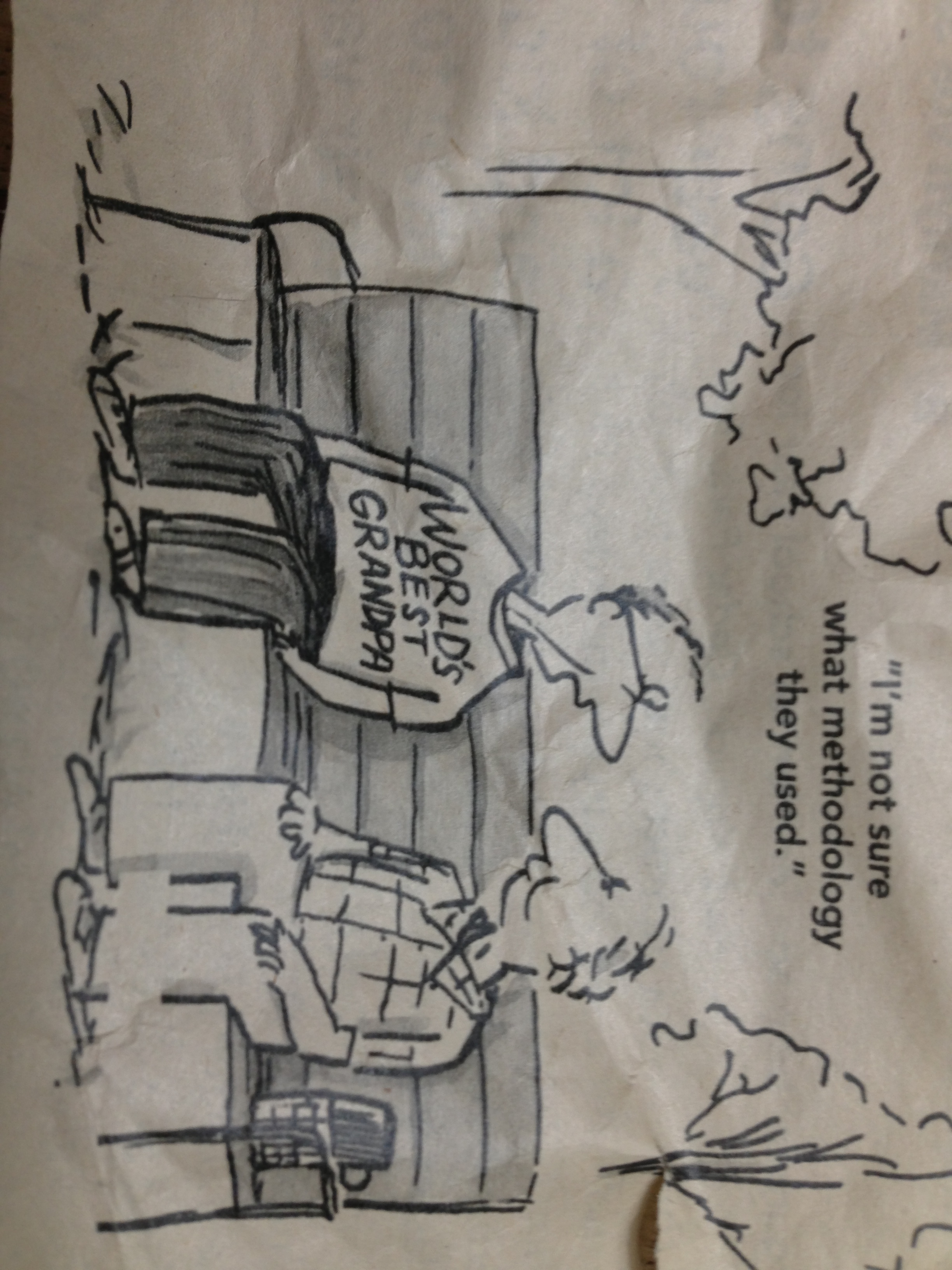 A — fortunately rare — danger of clutter build-up.  I cut out this comic, probably many years ago, meaning to give it to my dad.  Now that I’ve unearthed it, he is no longer here.  He certainly wouldn’t have worn a tee shirt with such a boastful slogan, but the caption reflected his strong analytical side:
