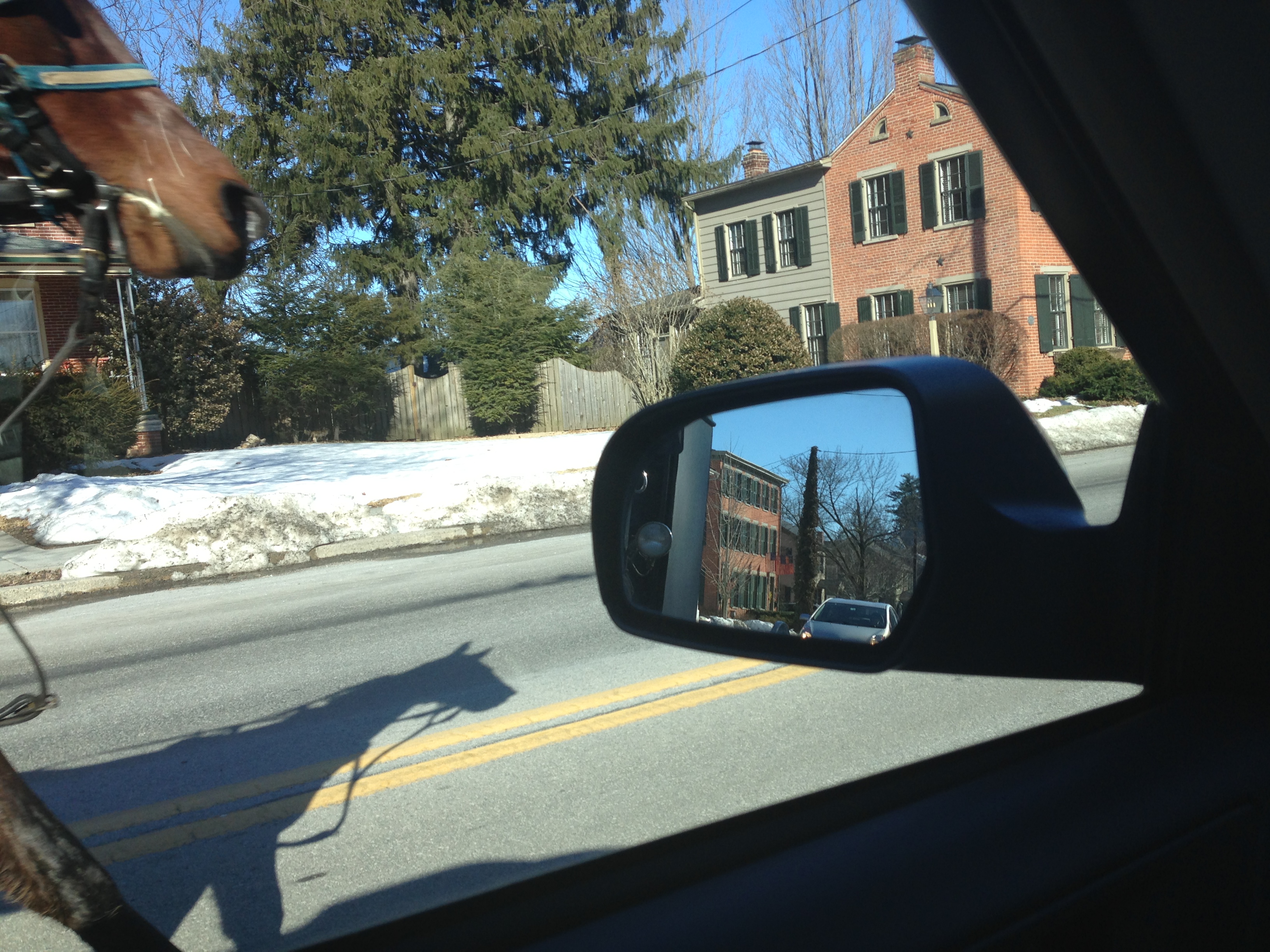 Outside, I heard one of the many Amish horse and buggies coming up behind me.  I was hesitant to invade their privacy with my camera, but I thought, I’ll just hold my iPhone up and snap it when it passes me. Below, a picture of an Amish buggy without taking a picture of an Amish buggy: