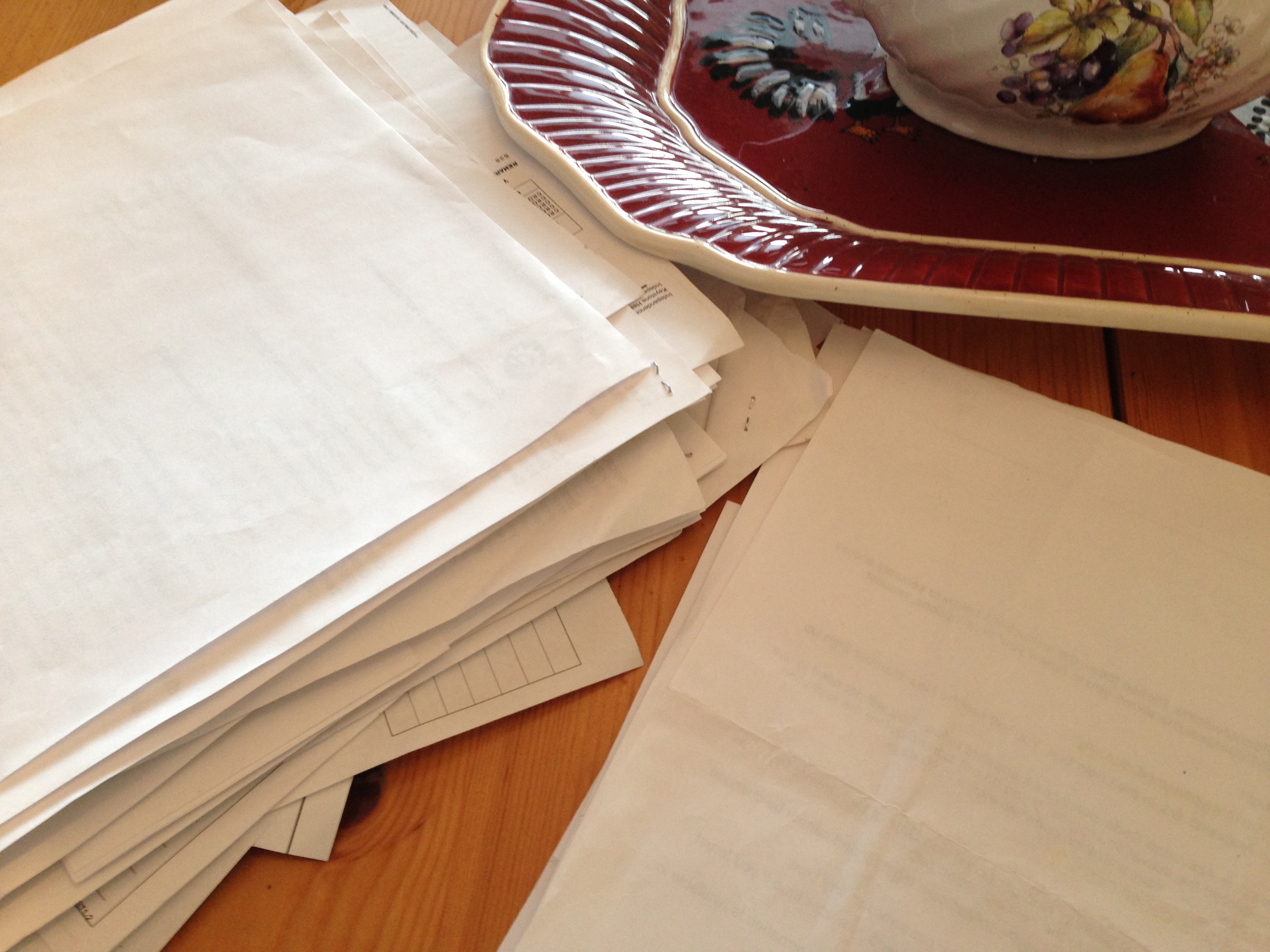 Second pile, for which I could have almost used the same photo, contained paperwork from charitable organizations, and a dash of EZ Pass statements. Most we shredded and recycled, while a few, detailing gifts, we filed in the appropriate tax folder.