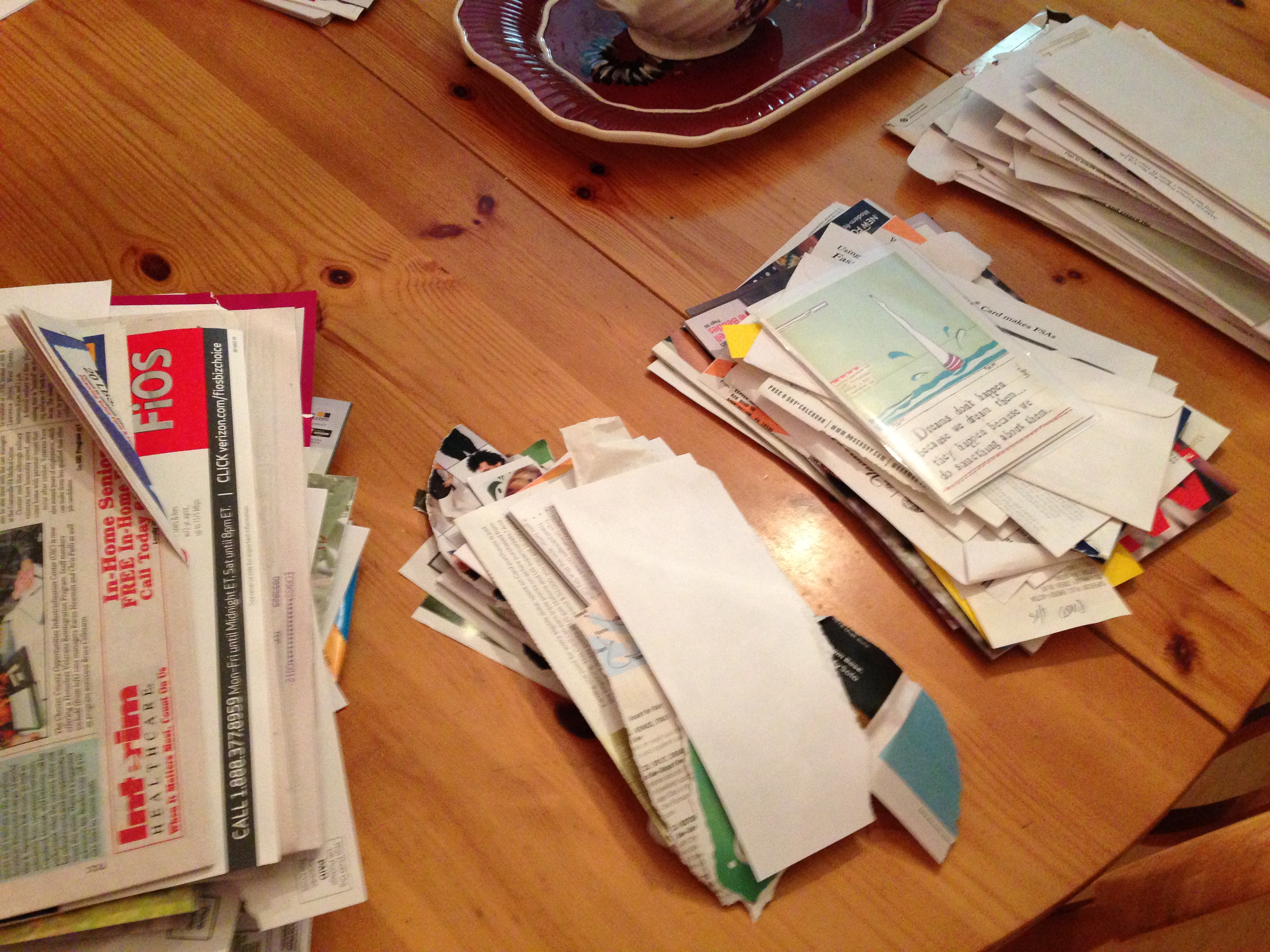 Since then, I caught a bad cold and have been feeling under the weather (which is a feat these days!). But I gave myself a kick in the pants to bust through the basket. The biggest pile (left) were all easily recycled, and next to it, a pile of our address labels ready for shredding and recycling. The other two piles are for my husband and me to look at and decide what to do with. Since we are both recovering from colds, this seemed enough for now. I had broken through.