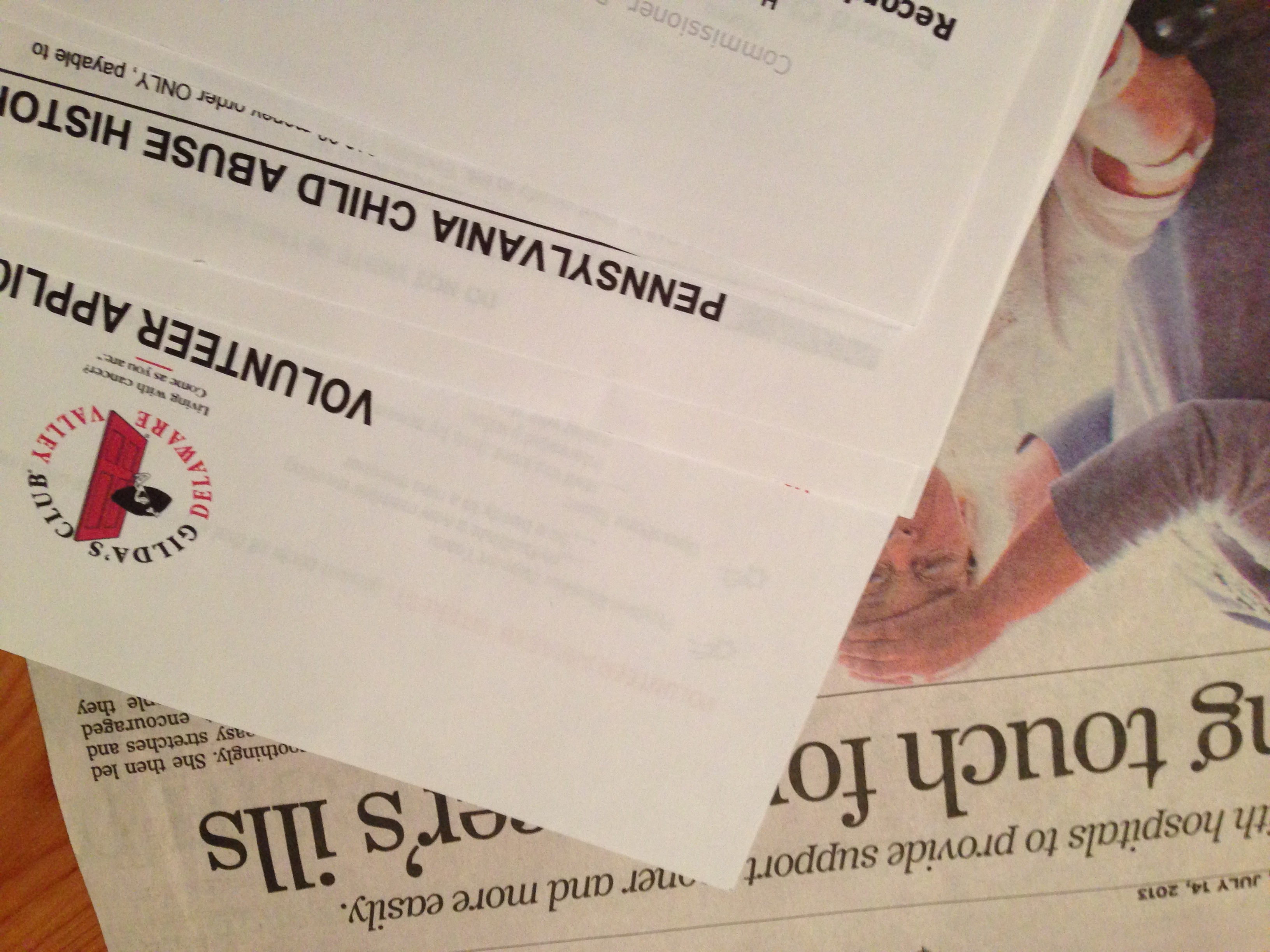 I was amazed at how quickly and easily, with the right attitude (okay, the right helper with the right attitude) things I’ve put off for so long just magically got done.  I had cut this article out of The Philadelphia Inquirer ages ago about volunteers who perform Reiki for cancer patients as a part of Gilda’s Club.  I had been interested in volunteering, and suddenly all the barriers to do so fell away when my daughter found the application and background clearance forms.  I was able to get the criminal check done online, almost instantaneously (“No Record”), and could print out the others.