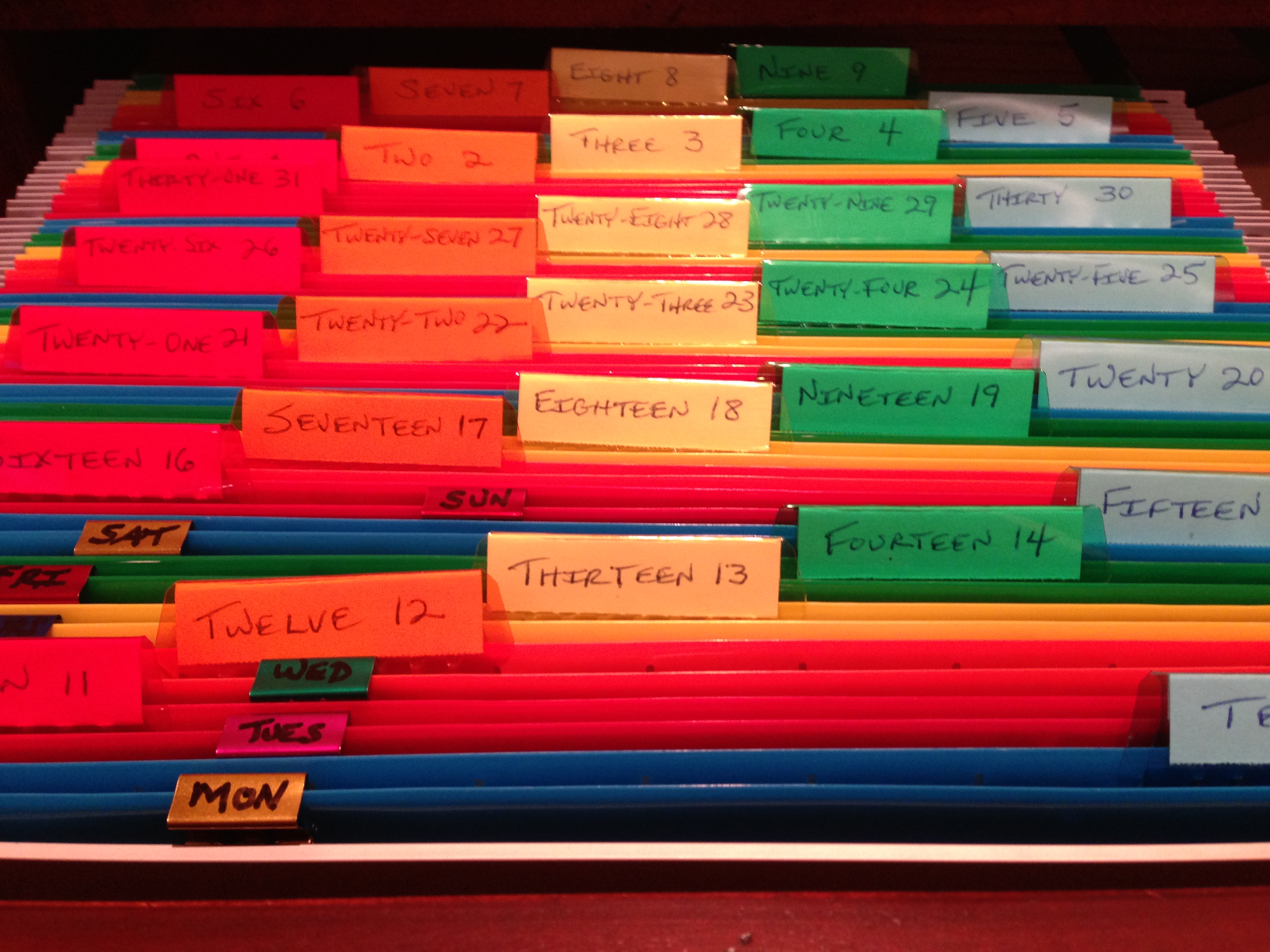 We also resurrected a filing system I’d previously failed to keep up.  It’s sort of a tickler file for items that will need attention in the future, and — ideally — keeps them from becoming lost or forgotten.  The file for tomorrow (eleven) holds a paper that’s a “to-call” reminder for an office that was not open today.  Each day of the month has its own folder …
