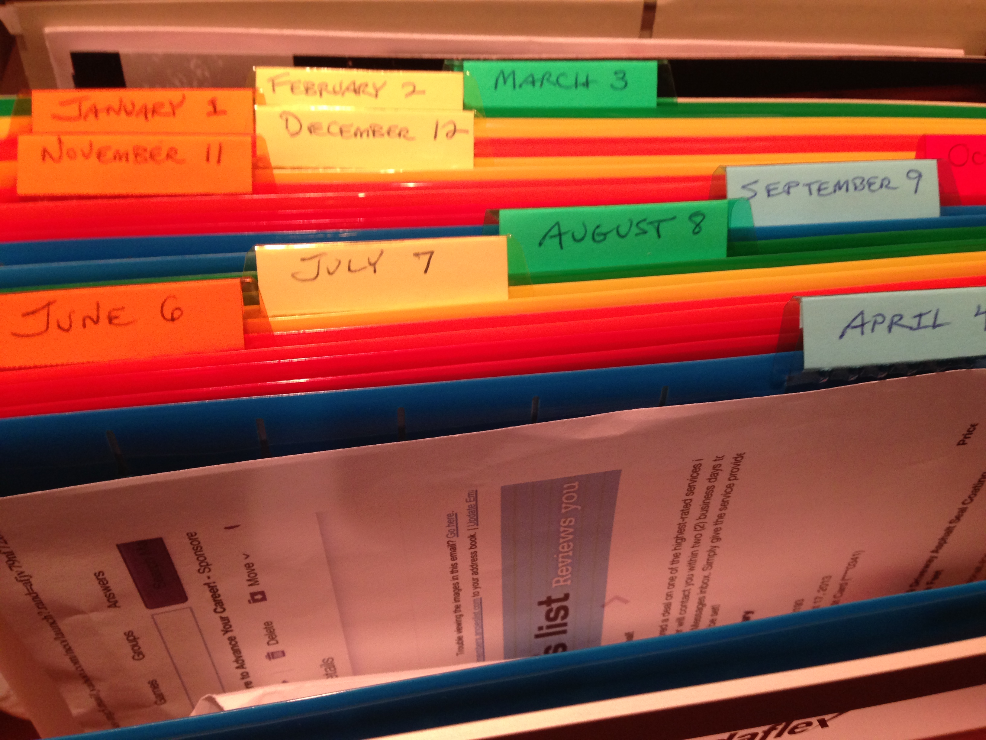 As do the months of the year, for papers and reminders for the months ahead.  The system is only successful if I consult the the files every day. Will I be able to do it?  We shall see.