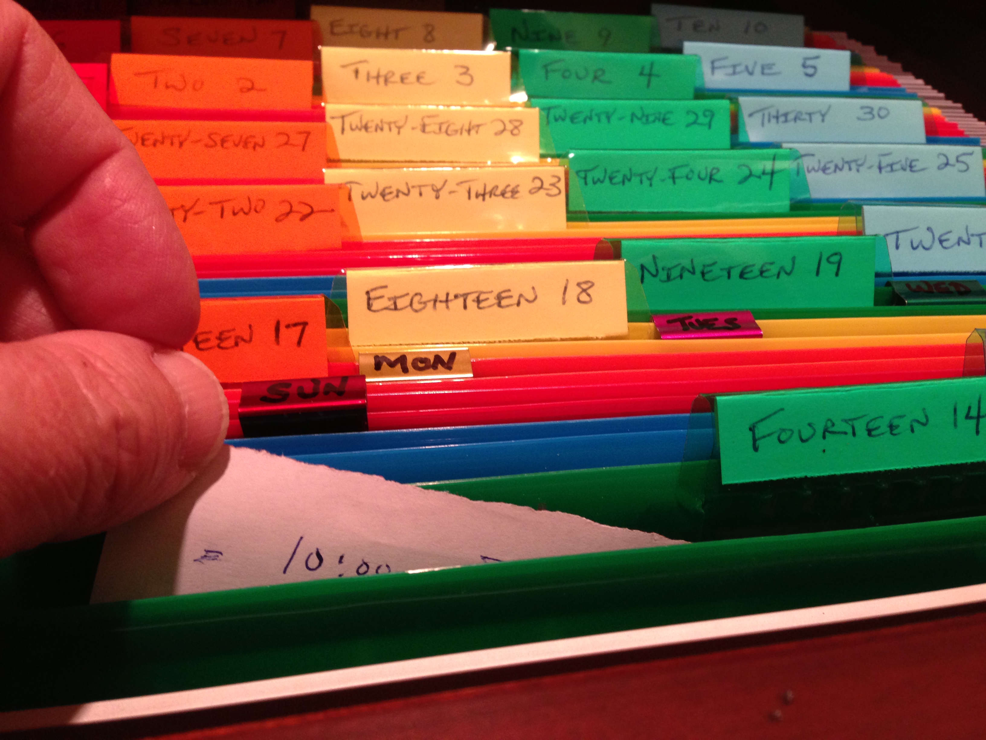 So far I’ve had a good record for using my tickler file.  My strategy: I’ve promised myself I will look inside the day’s folder before I look at anything on the computer.  The two are close to each other, so it has been a cinch … kind of a habit hook.