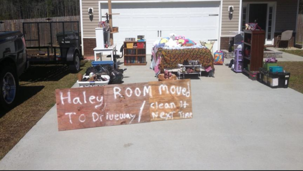 I saw a story on the web today about a father who put the contents of his daughter’s messy bedroom out in the driveway with a sign, below. From the looks of it, even the curtains. It had aired on Good Morning America. The daughter, Haley, seemed to have taken her punishment quite well, considering the humiliation … poor girl. Then I realized that, in a way, I’m doing the same thing with the contents of our son’s room, publicizing it for all the world to see! (With his permission, of course.)