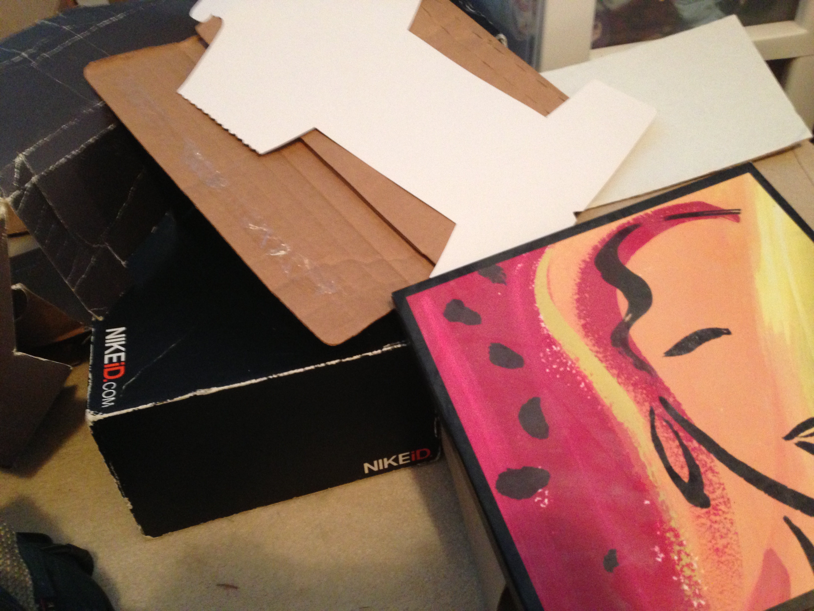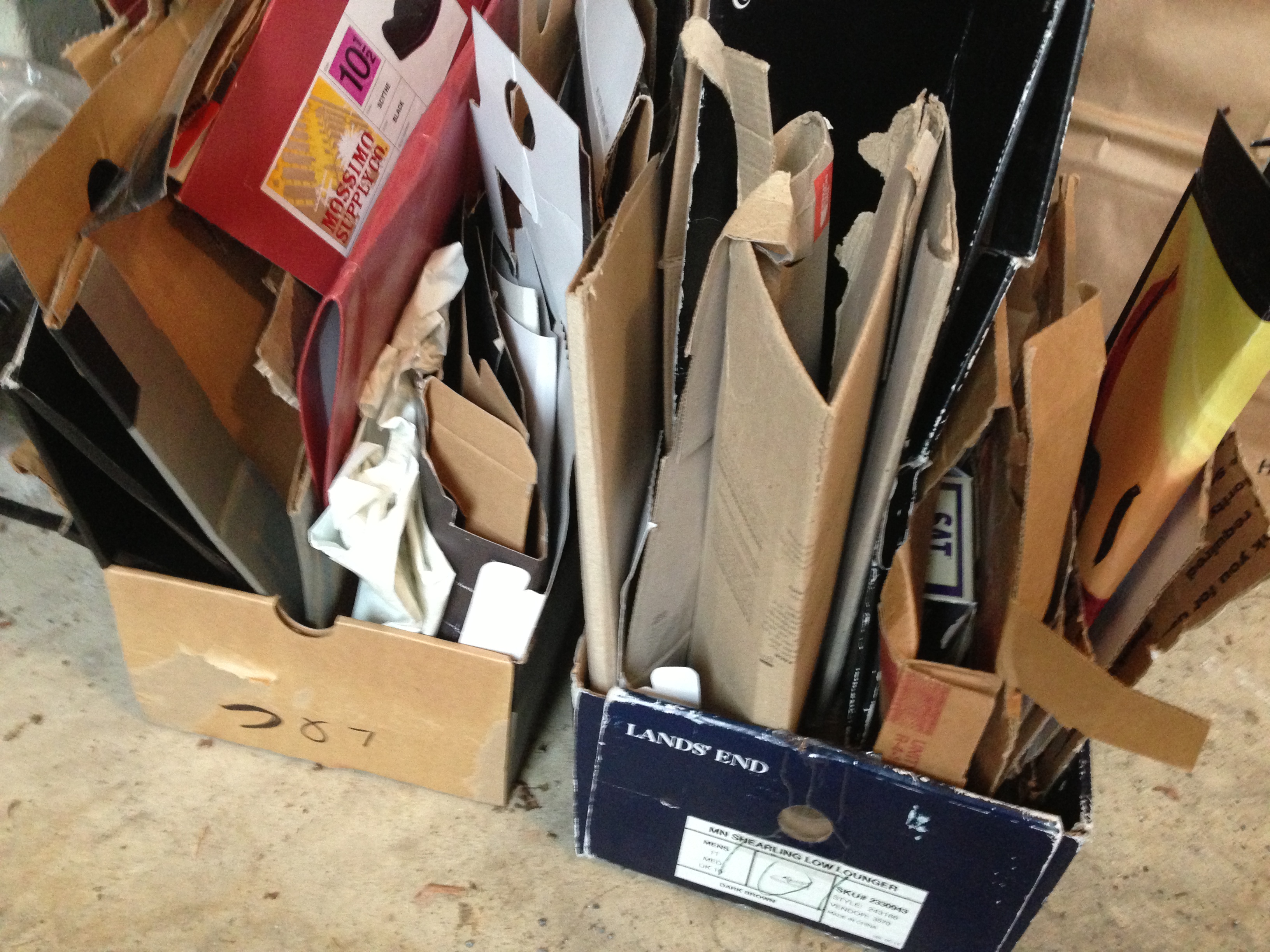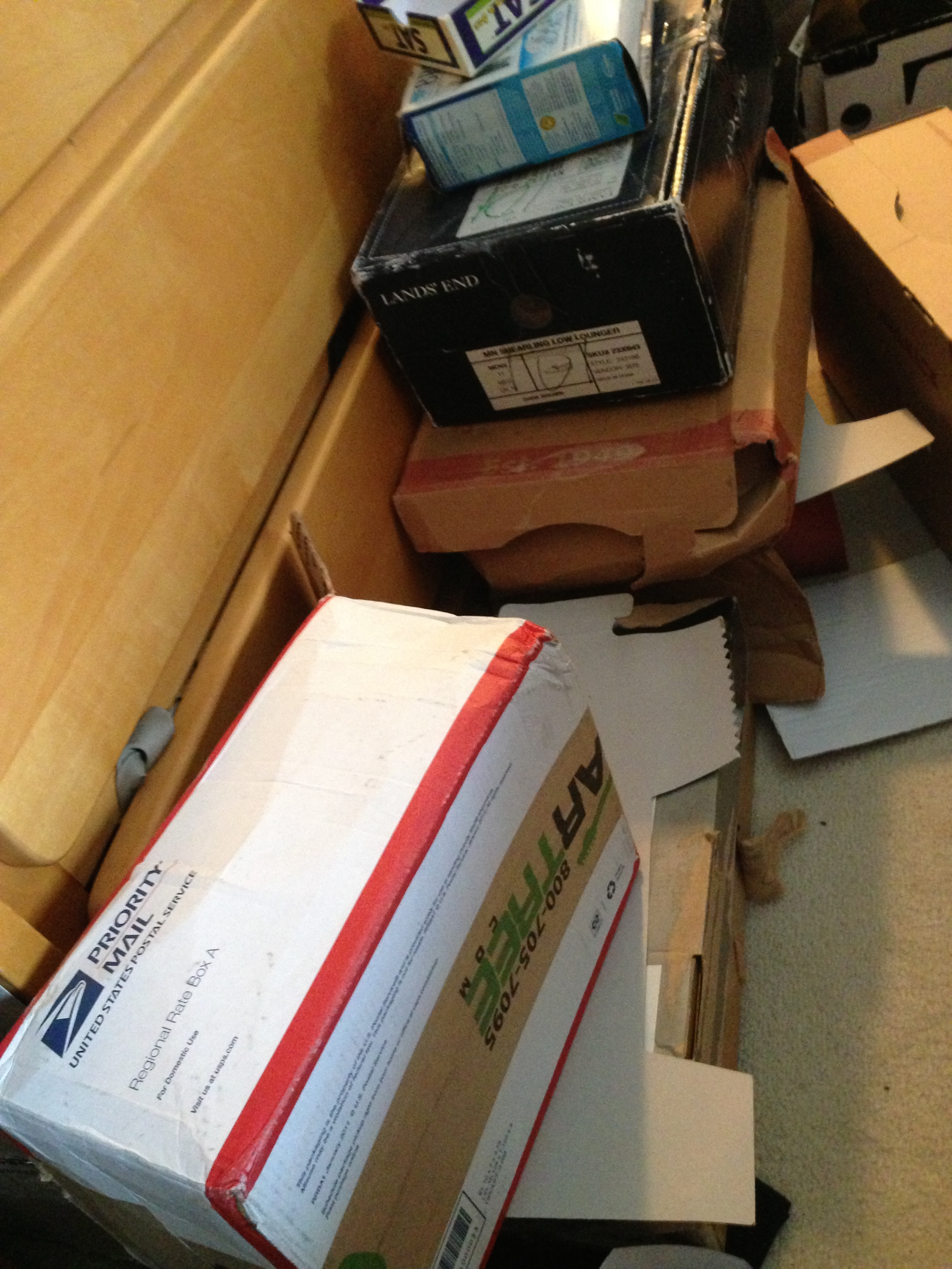 It has been a collaborative effort. Many of the boxes I bulldozed through today were from cool shoes he had either purchased or received as gifts; he had saved the boxes for possible resale. He now admits that the shoes are pretty thoroughly banged up and wouldn’t be sellable. (Very satisfying to get rid of the box on top for SAT flash cards … you’re outta here!)