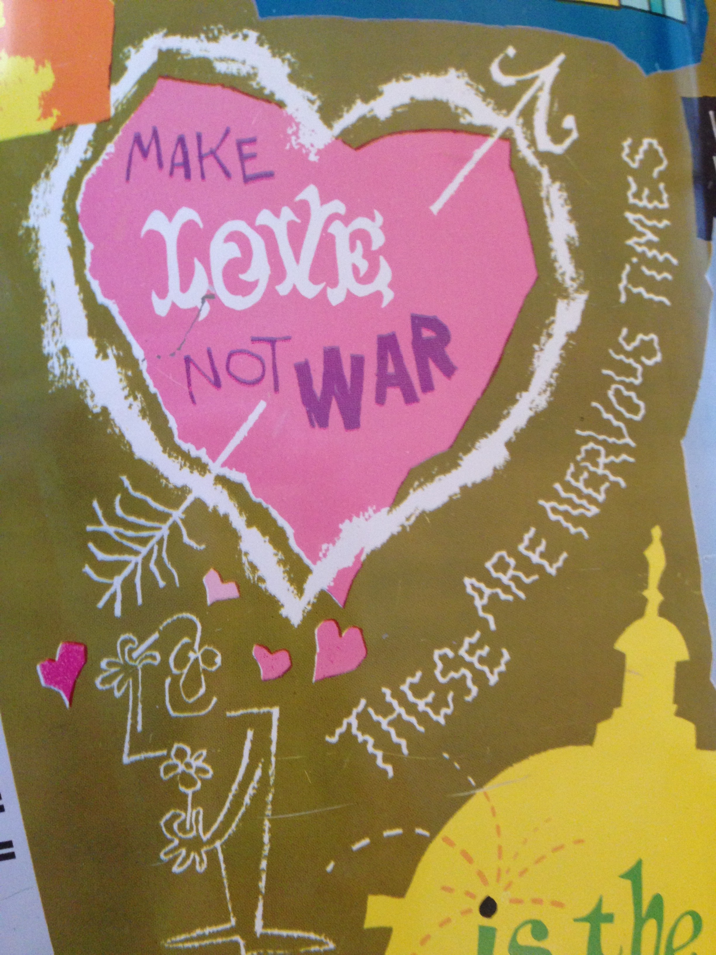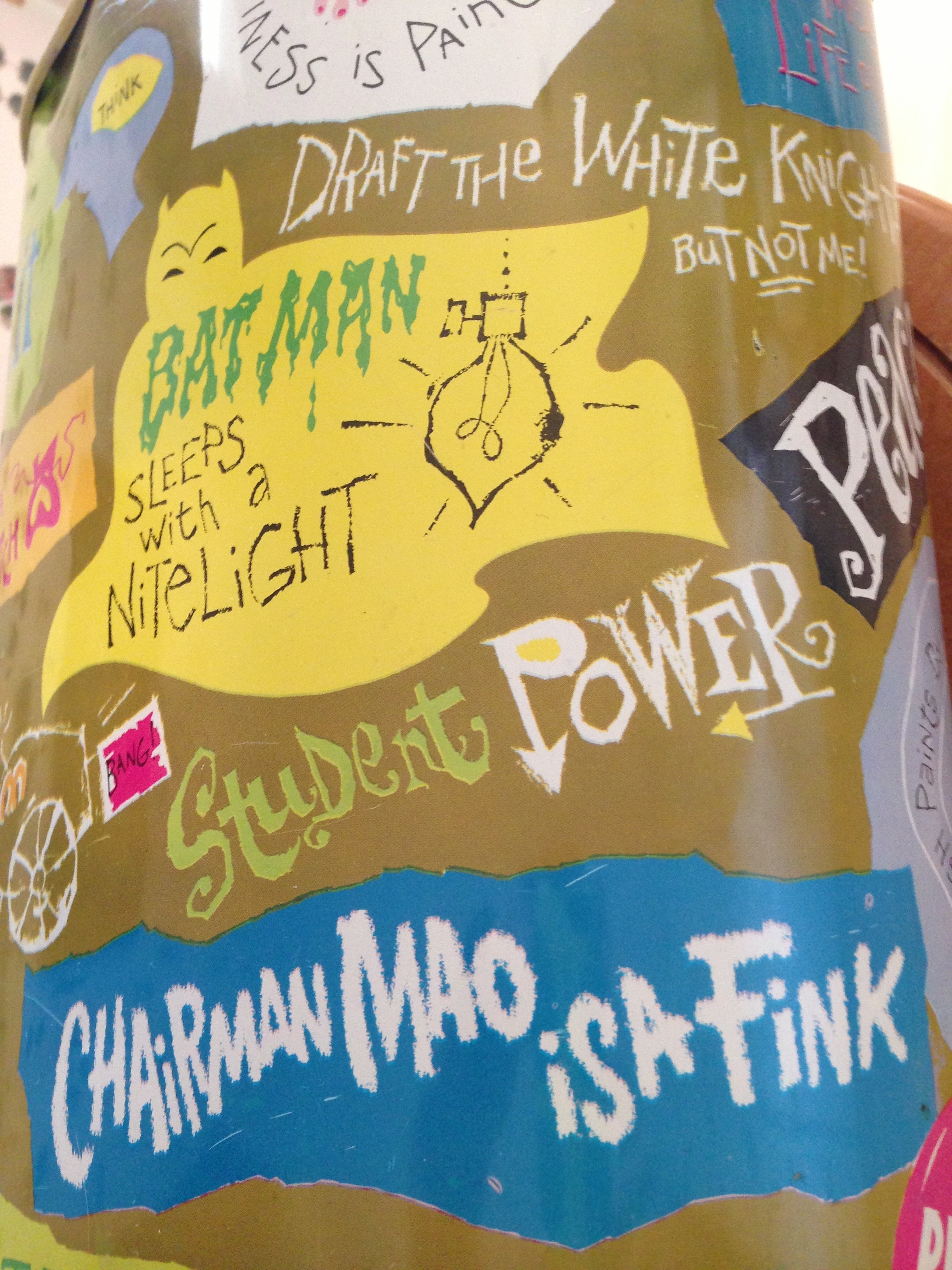When this trash can was made, the war in “Make Love Not War” was the Vietnam war.  And I guess everyone in every time period thinks they are living through “nervous times,” but …