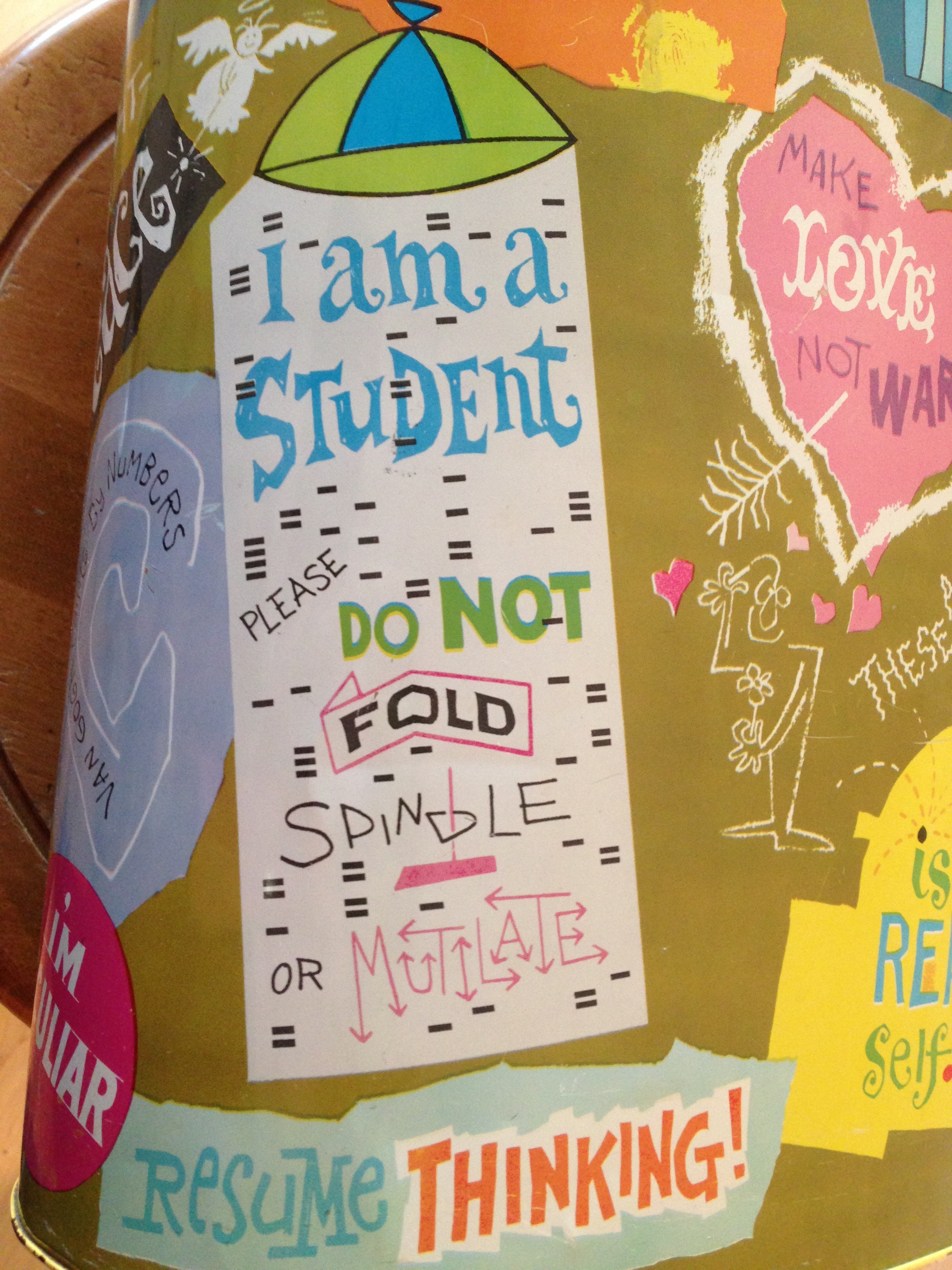 The trash basket on the left, above, was from our son’s college days. The one on the right stayed in his bedroom at home … fascinating, right?  The truth is, that one does have its fascinating aspects.  It was a relic from my husband’s youth.  He says he might have gotten it in middle school, or junior high, as we called it way back then. Little did he know that it would turn out to be a time capsule. Remember the old computer punch cards that couldn’t be folded, spindled, or mutilated?