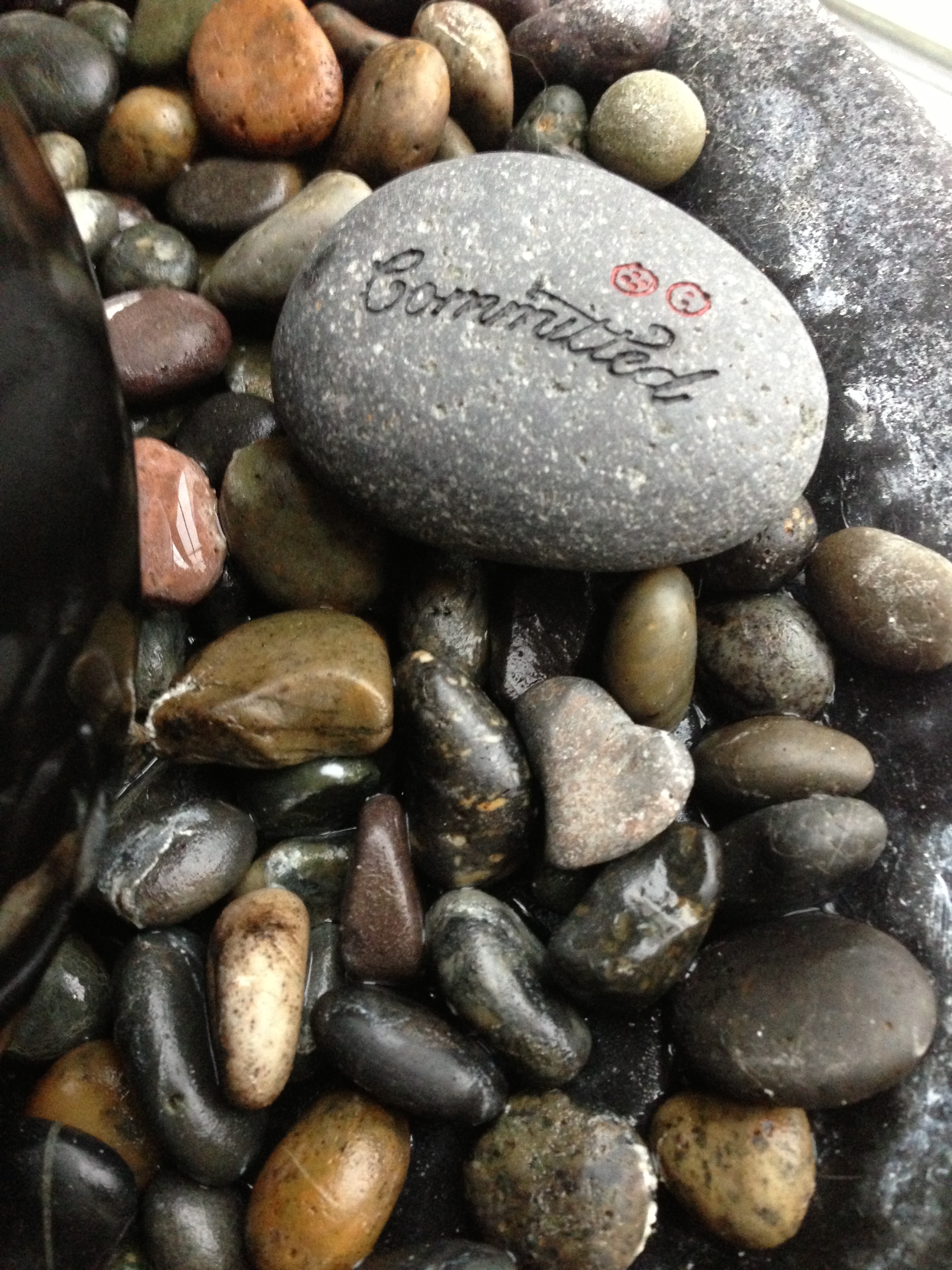 I had the idea of adding it to the rocks in our indoor fountain; it’s the second pebble below the “Committed” stone. I found that “Committed” stone at Two Buttons, a store Elizabeth Gilbert, author of Eat Pray Love, runs with her husband in Frenchtown, NJ. The name “Committed” is from her book about marriage. When I bought it, I was bubbling with the urge to start a blog, but afraid, not only of technology, but of starting something I couldn’t commit to.