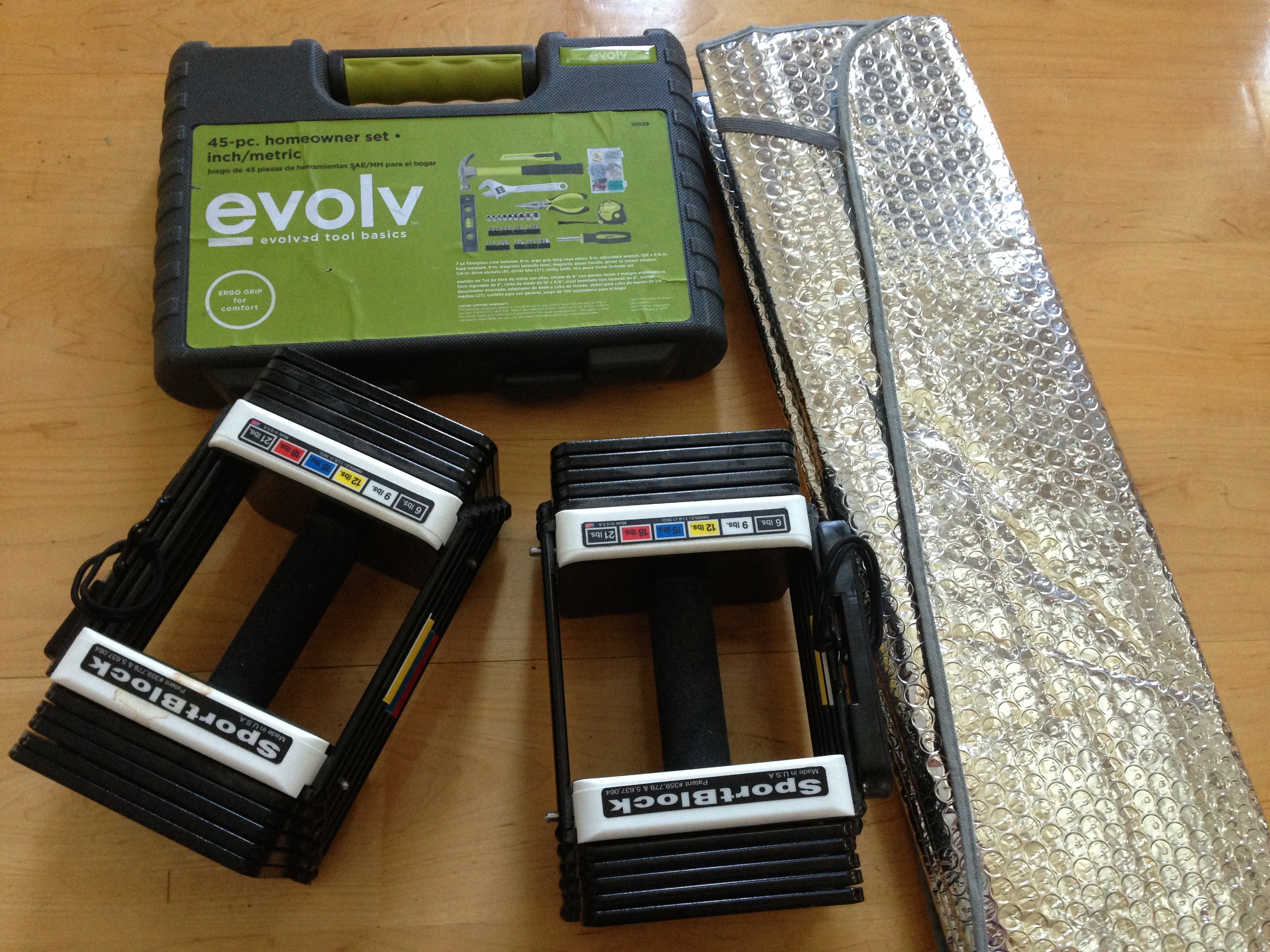 An easy clump, as clumps go.  I had to tell myself that the goal is not always quantity, but consistency — keeping the momentum going. The windshield protector went into a car, the weights into the basement with similar exercise equipment, and the toolbox with other things to save for our son’s collection … it will join the bag ‘o office supplies from yesterday’s clump.