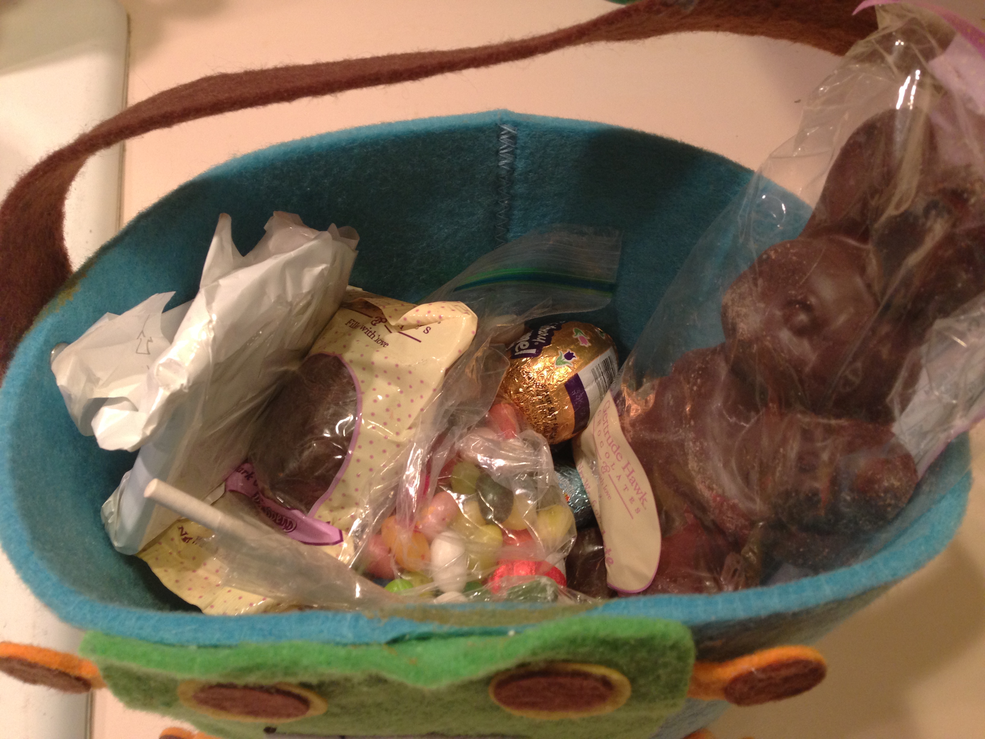 I left the same kind of felty basket for my three kids last year and they, too, left a lot of uneaten chocolate. Your monster face is a nice touch, as was the bunny pasta!