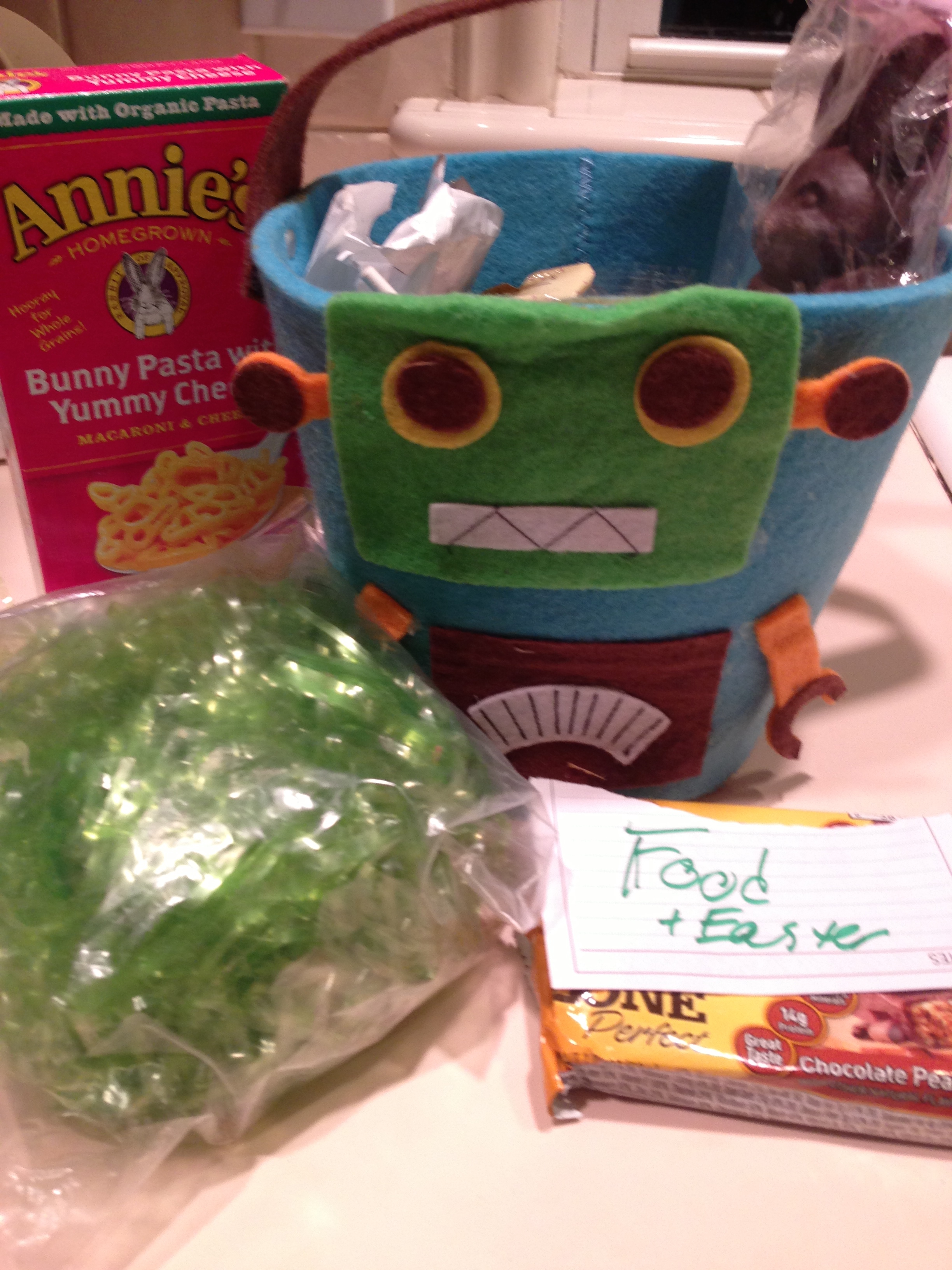 I really can’t remember what year I sent this Easter “basket” to our son at college.  The bunny pasta has an expiration date of 5/08/14, so one of us should eat it up soon.