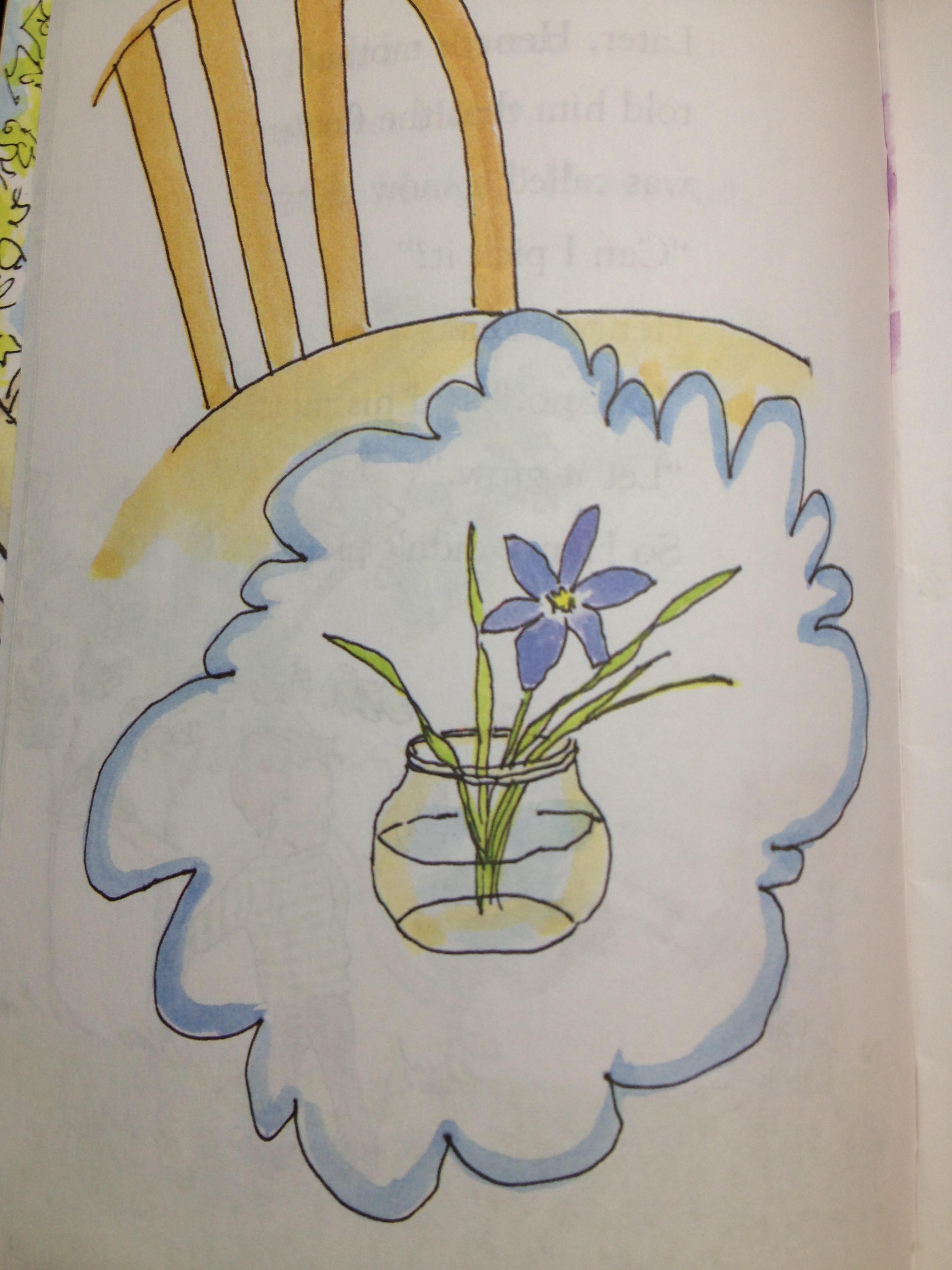 And then they discovered a blue flower. “‘Can I pick it?'” Henry asked. ‘Oh, no,’ said his mother. ‘Let it grow.'”… Henry couldn’t stop wanting to pick it and imagined putting it in a jar. … “He thought how nice it would be to own that snow glory.”