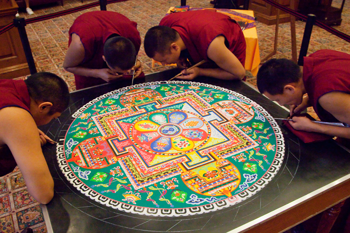 “The Sand Mandala is a Tibetan Buddhist tradition involving the creation and destruction of mandalas made from colored sand.  A sand mandala is ritualistically destroyed once it has been completed and its accompanying ceremonies and viewing are finished to symbolize the Buddhist doctrinal belief in the transitory nature of material life.”