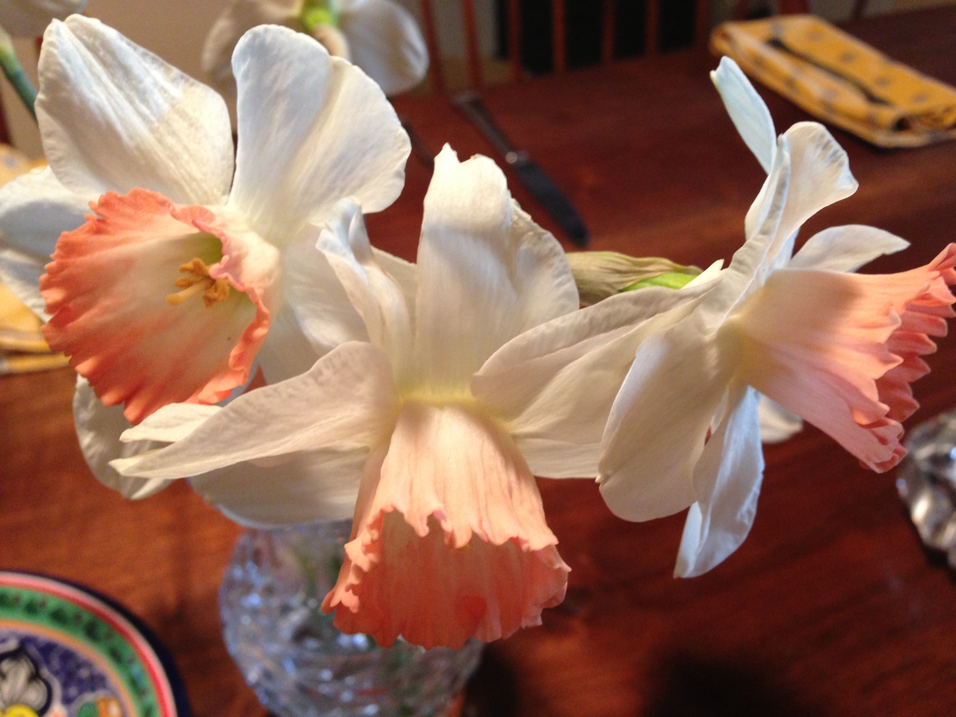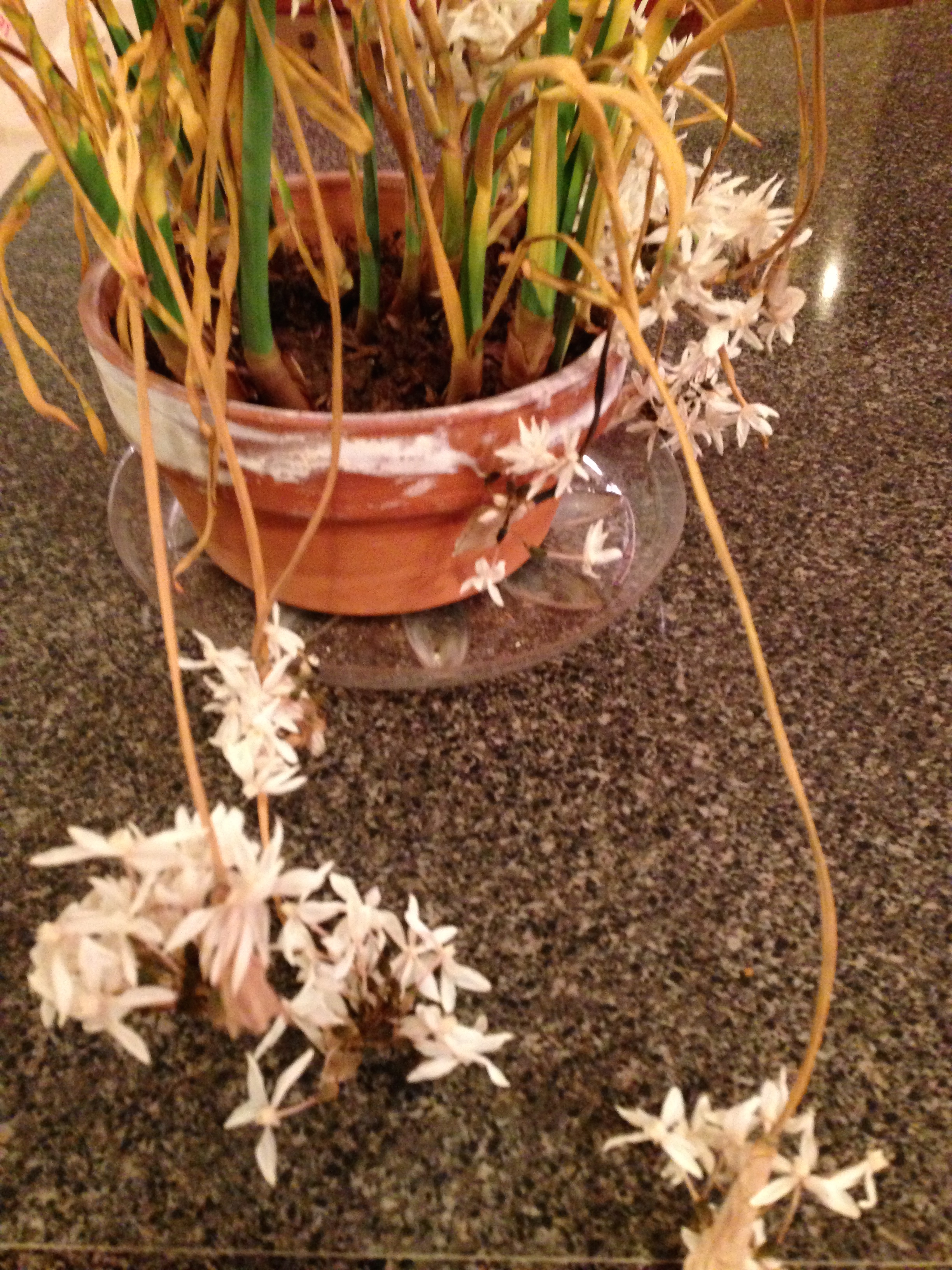 Funny how the presence of outsiders makes you see things you can’t believe you’ve let go.  Case in point: a pot of paperwhite bulbs given to us at Christmastime.  I guess I was so grateful for their promise of spring, fragrance, and life, even when dried out.  Out they go.  The pot is soaking in water with white vinegar, which will clean it right up.