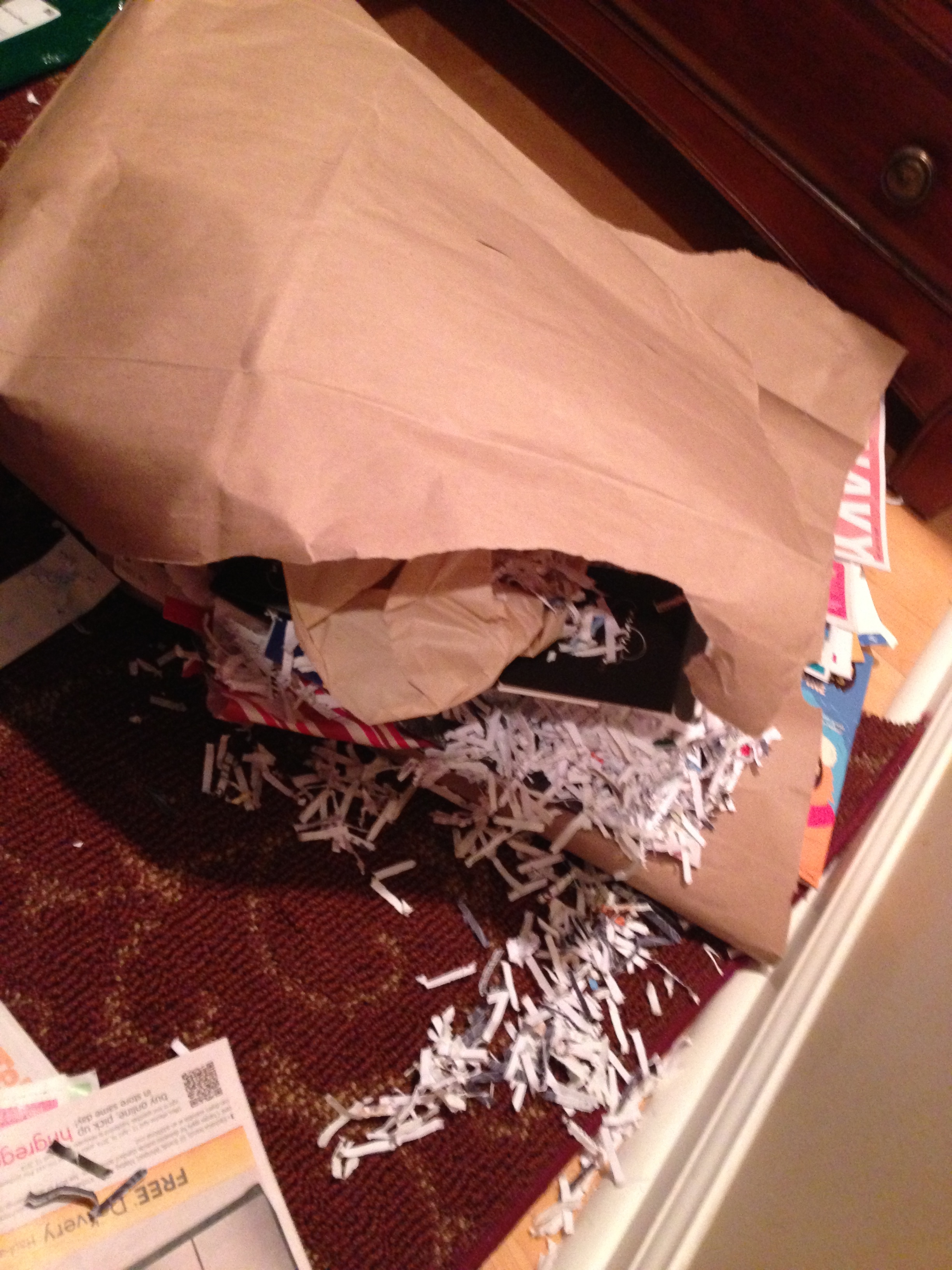 It heroically contained the mealworm-like paper shreds and saved both the corner of the study and my temper.