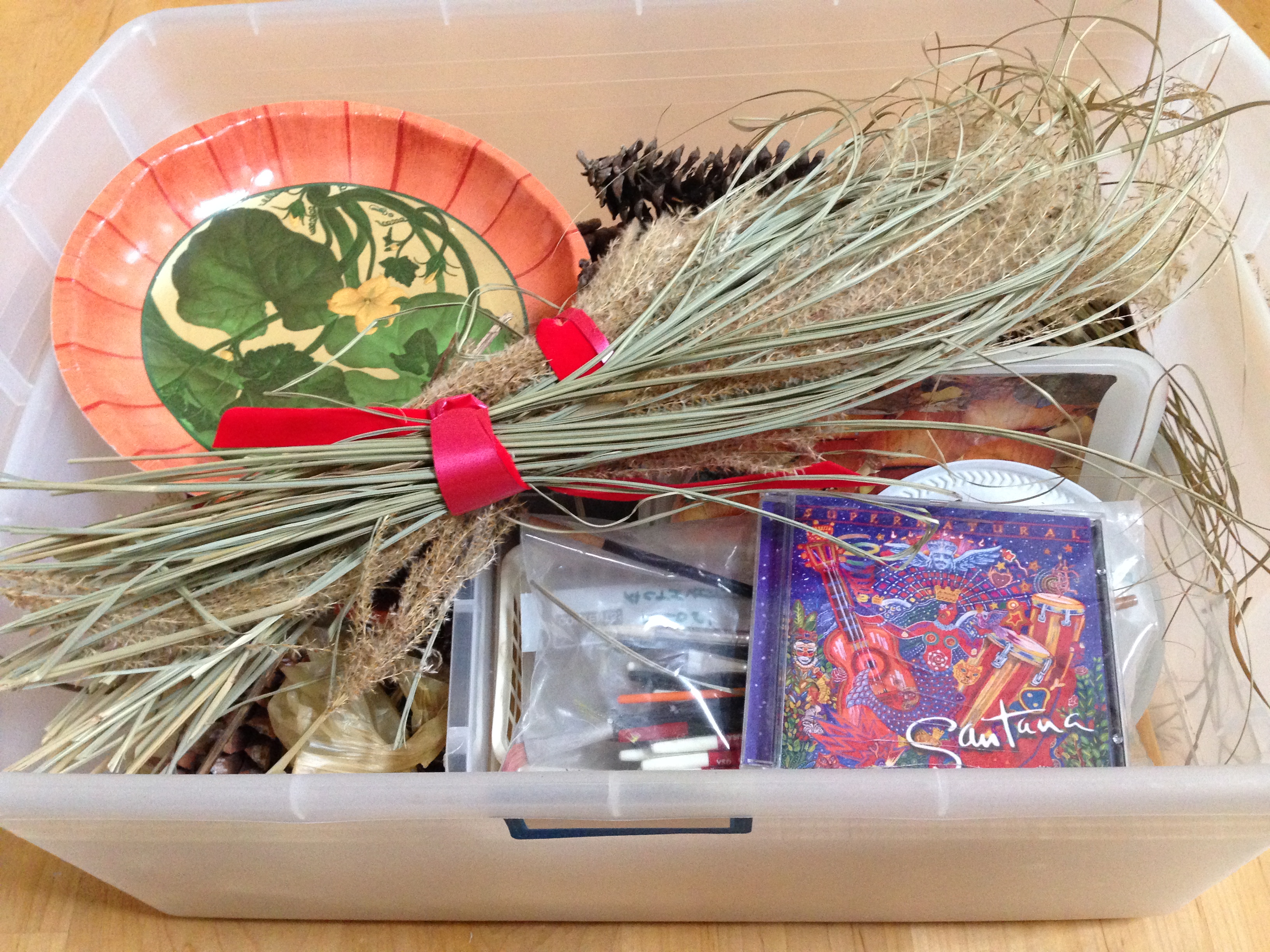 Here’s one payoff for confronting clumps of long forgotten stuff.  I looked into the box below, and — lo and behold — alongside pumpkin-decorating materials, there was the Santana “Supernatural” CD we’ve been missing for years!  Hooray!  The contents of the box dated from the time I was in charge of kids’ activities for our Quaker Meeting’s Fall Festival.  Santana and Rob Thomas’s song “Smooth” was my choice for a cake walk song no one could resist moving to.  “Man, it’s a hot one…”