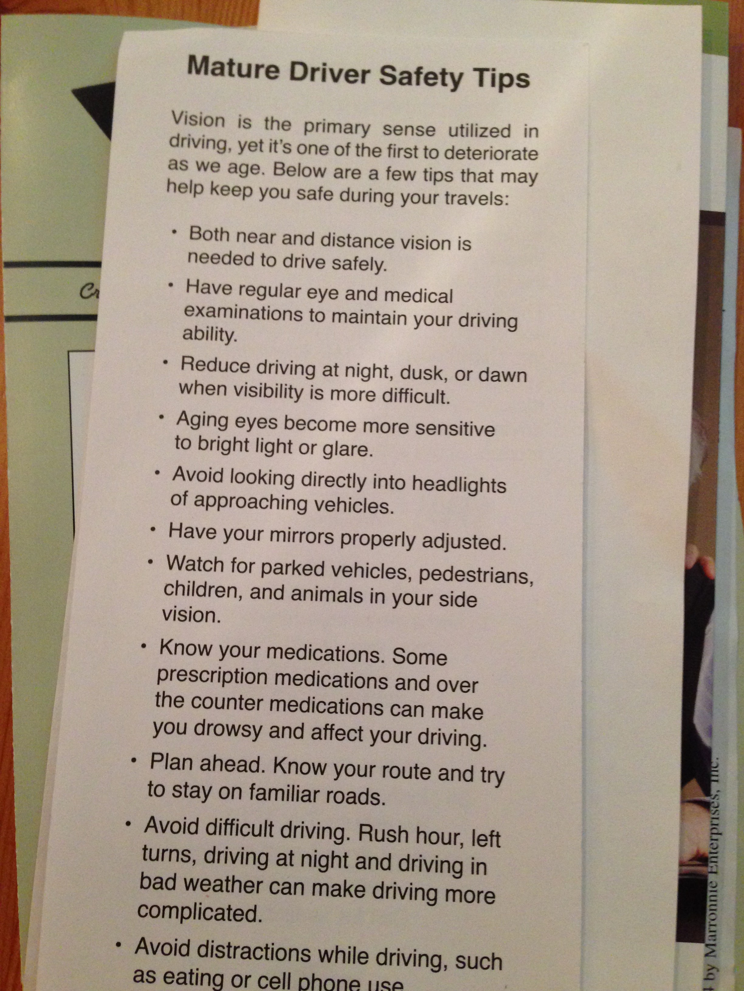 One paper that caught my attention was this one listing “Mature Driver Safety Tips” that for the first time came with my driver’s license renewal form.   I didn’t keep it, but if I did, I would have to file it under “You know you’re getting old when …” Ugh.