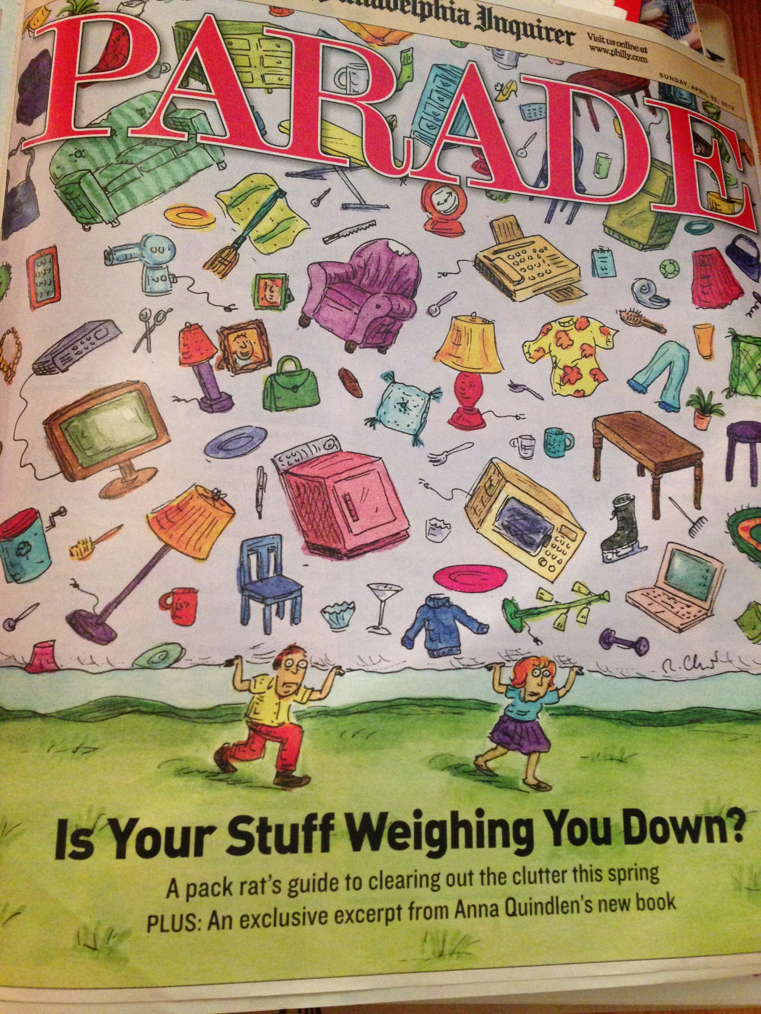 I had taken the photo below of an old Parade magazine during the big paper purge. This is exactly the way I felt today. We were working against the clock, and at one point, I said to our son, “What would I do without you?” With a strained expression and pleading tone of voice he answered, “Start earlier?” From the mouth of babes (or dudes, or gents …). The truth hurts, as do my sore muscles and back.