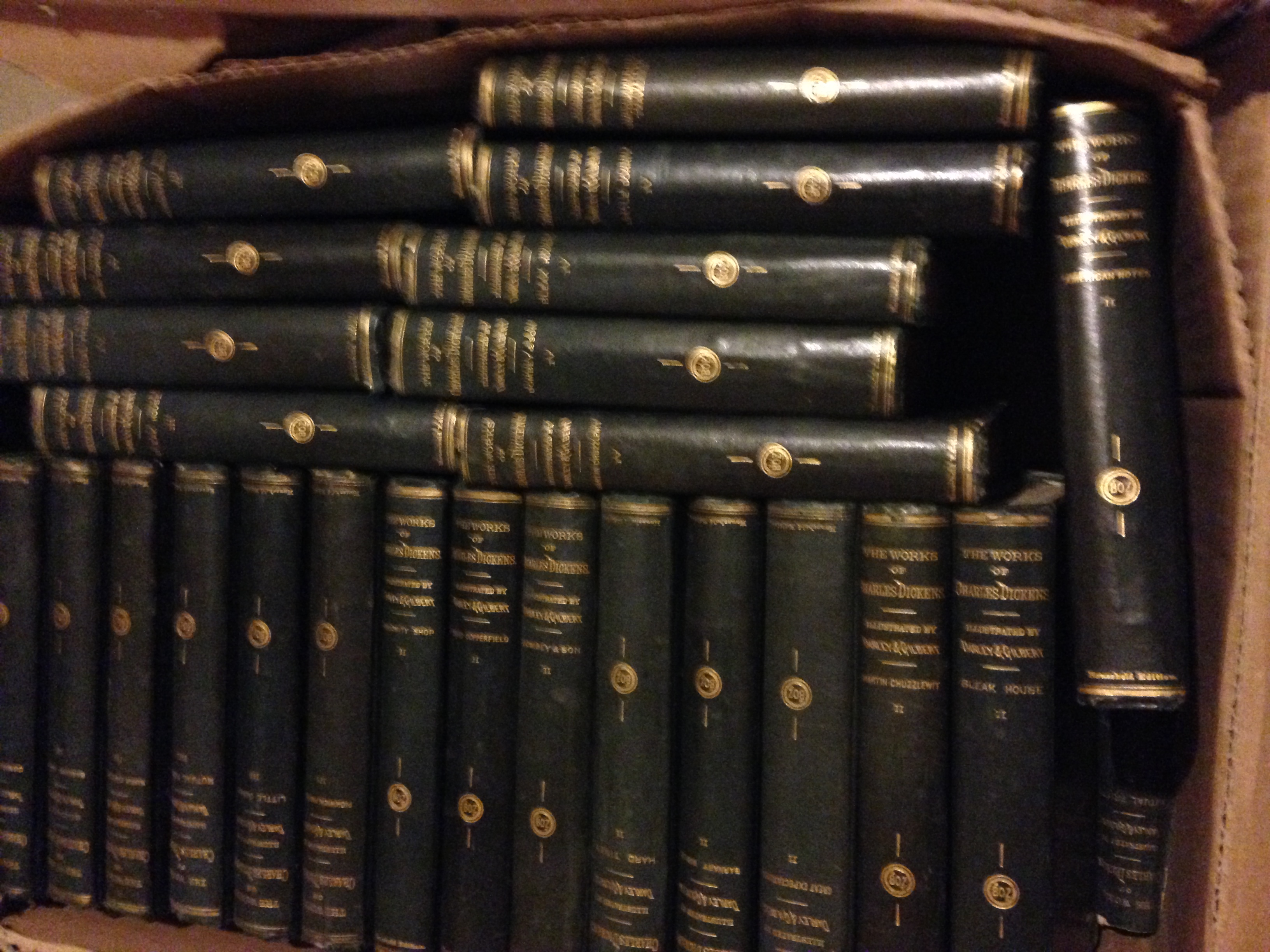 I guess people pay good money to do step aerobics with weights. That’s essentially what the job felt like. The complete works of Charles Dickens, below, weigh about a gazillion pounds. I have hauled them from my parent’s bookshelves to our home, to at least two used book sellers (who were not interested in buying them); our younger daughter hauled them upstairs, and I lugged them back down to the basement. Somehow this description doesn’t seem to include enough hauling steps, but you’ll just have to trust me. Talk about an albatross. Enough is enough! I’ll donate them to whoever will have them. This will be the first clump out of the basement. I promise.