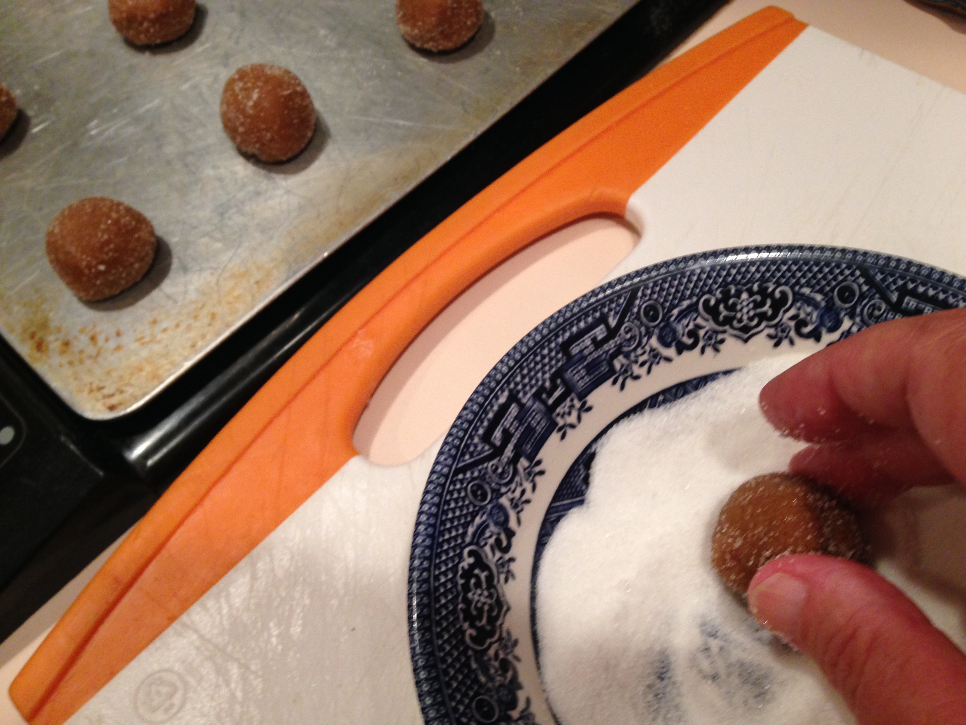 Chill dough 2 hours. Form into 1-inch balls. Roll each ball in granulated sugar. Place on baking sheets. Sprinkle each cookie with 2-3 drops of water. Bake at 375 degrees for 8-10 minutes. (I always opt for 8 minutes.)