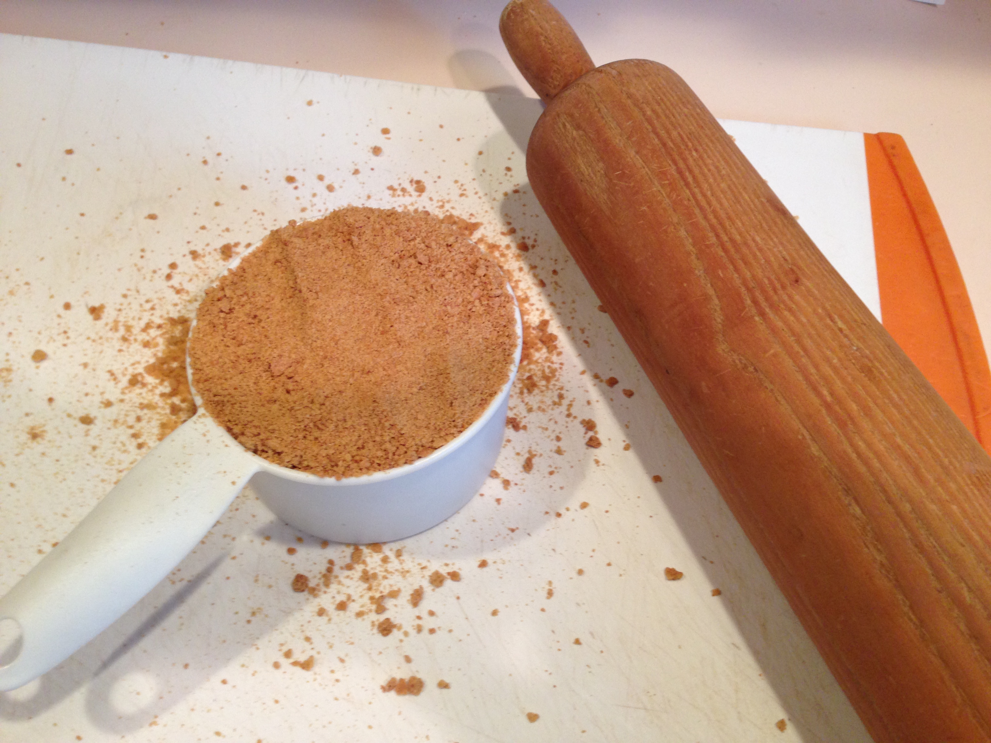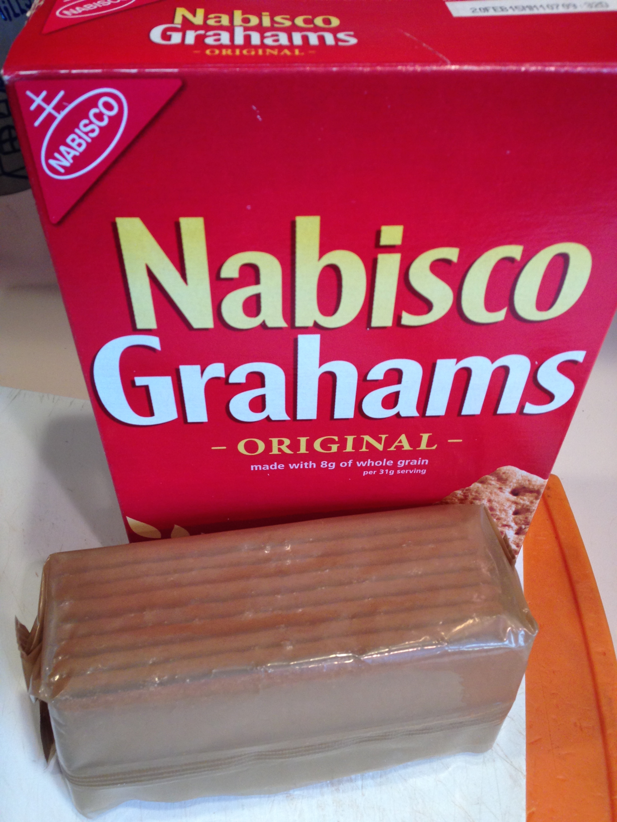 The cake is the graham cracker part of the S’mores equation. It contains one cup of graham cracker crumbs, or nine crackers. How many crackers in a package? Nine. Very satisfying.