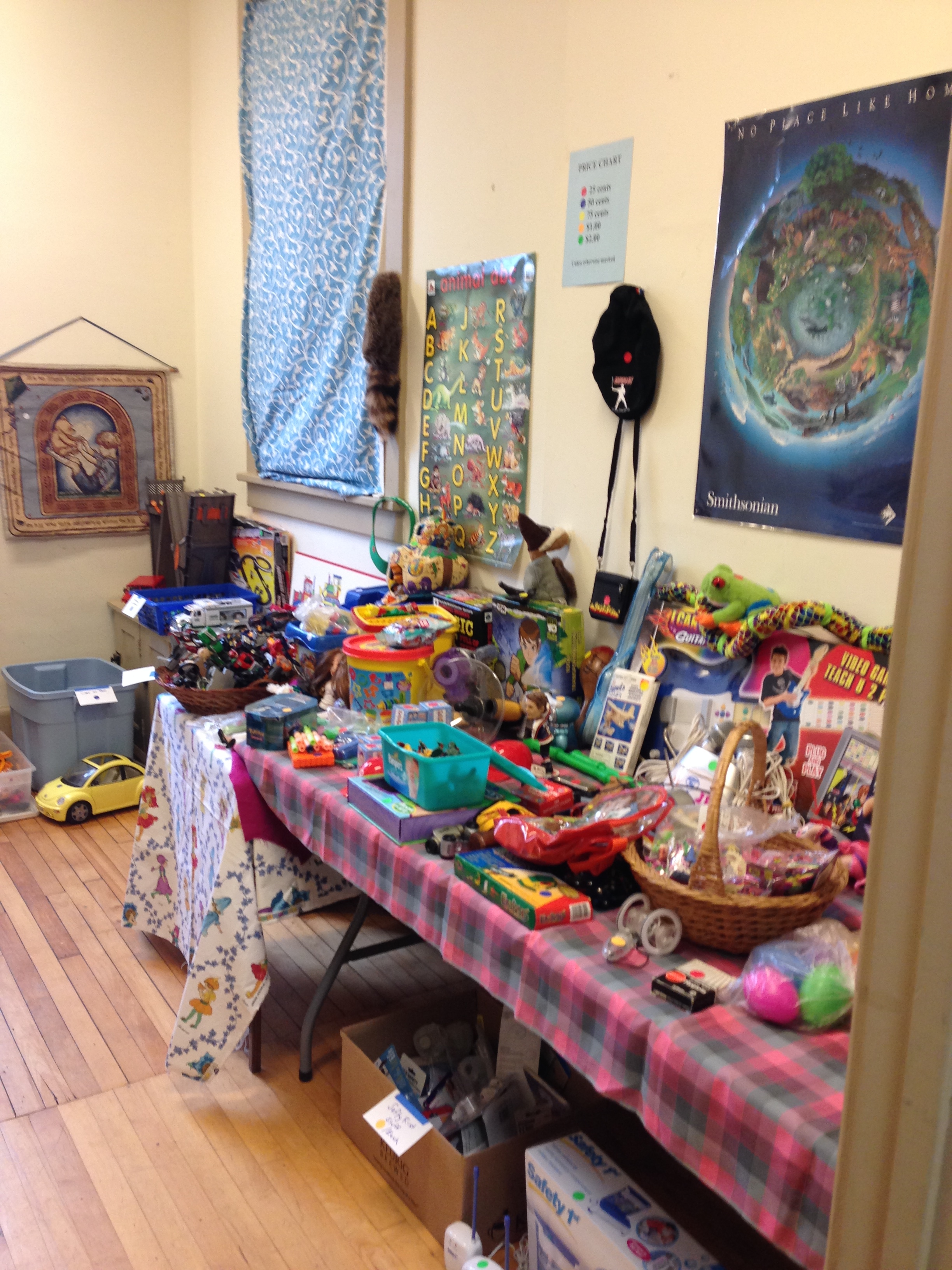 In other Fall Festival news, I organized the toy room for the Mercantile, the flea market-type sale we hold indoors. Here is a glimpse of the room before: