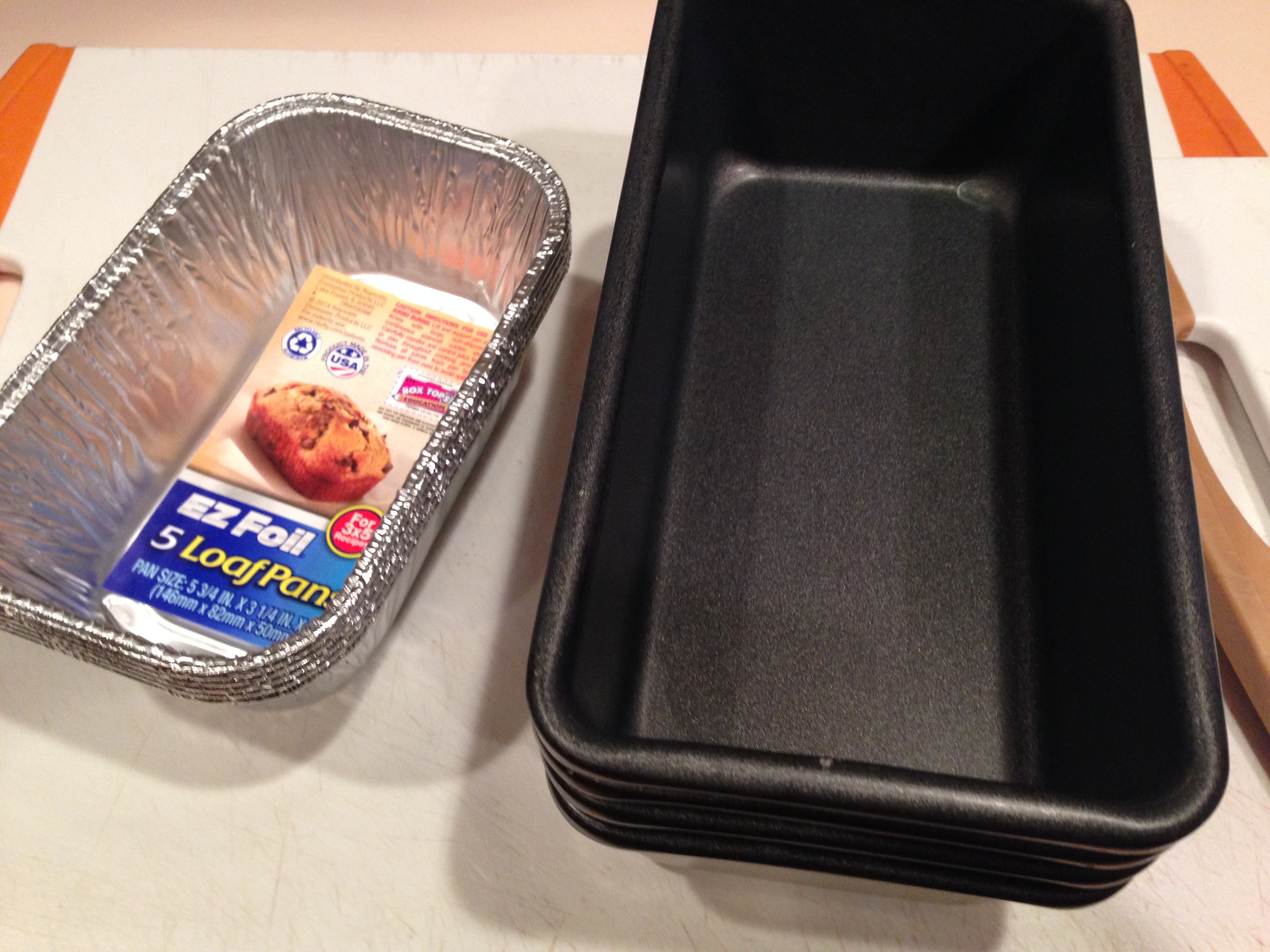 The recipe makes four mini loaves, which I had imagined to be the size of our mini loaf pans on right. Not mini enough. The 5 and 3/4 inch size is on the left.