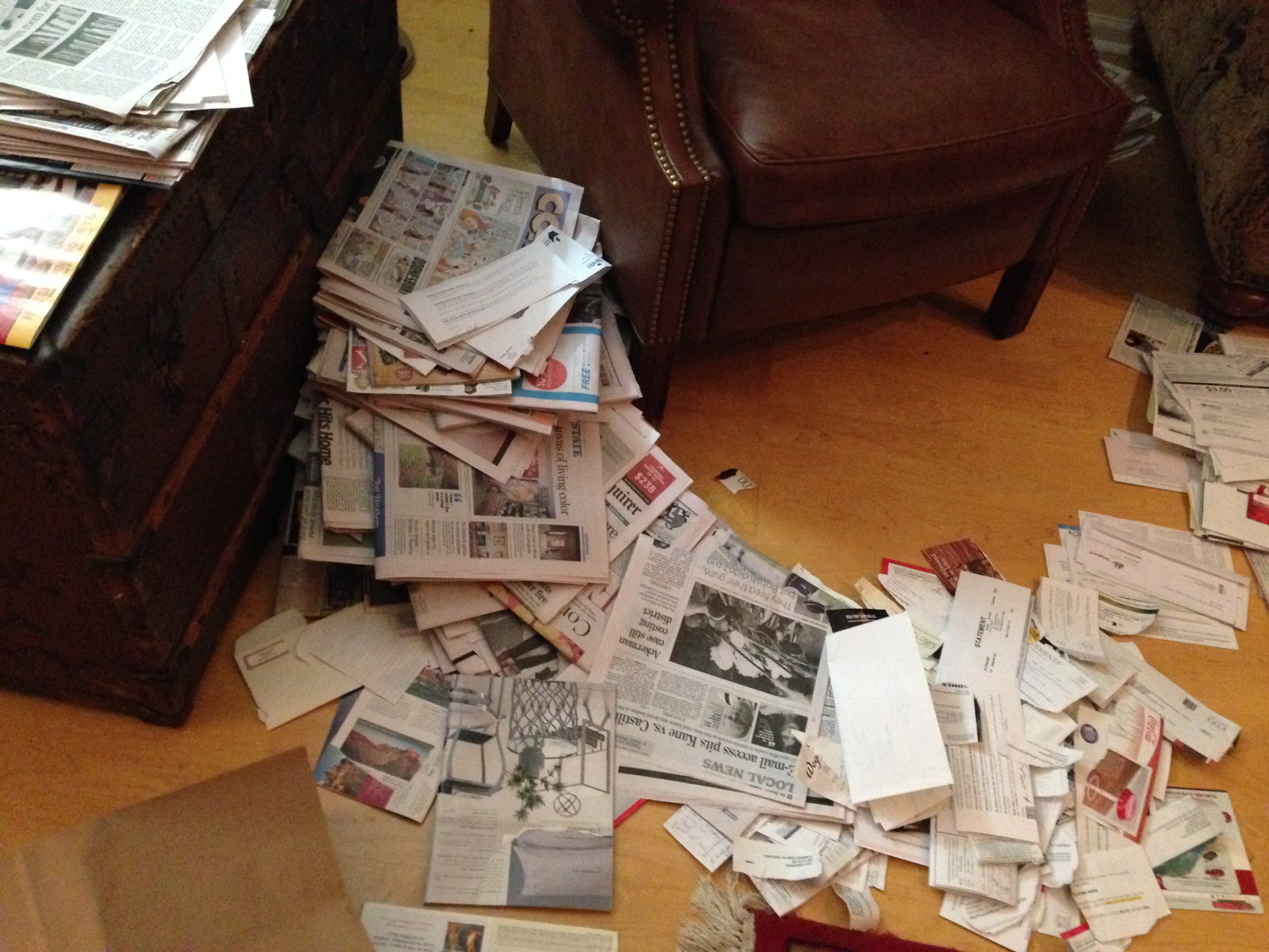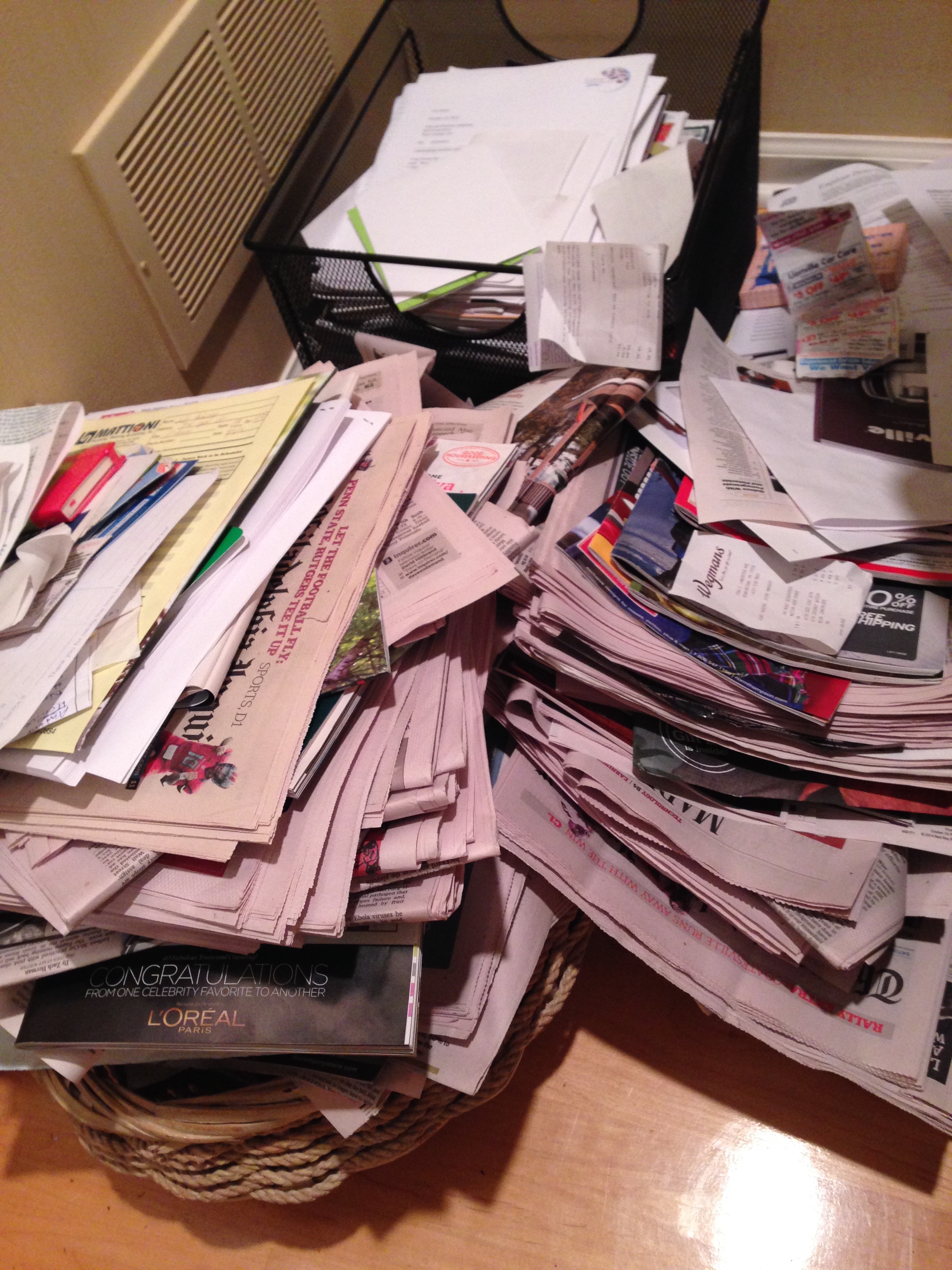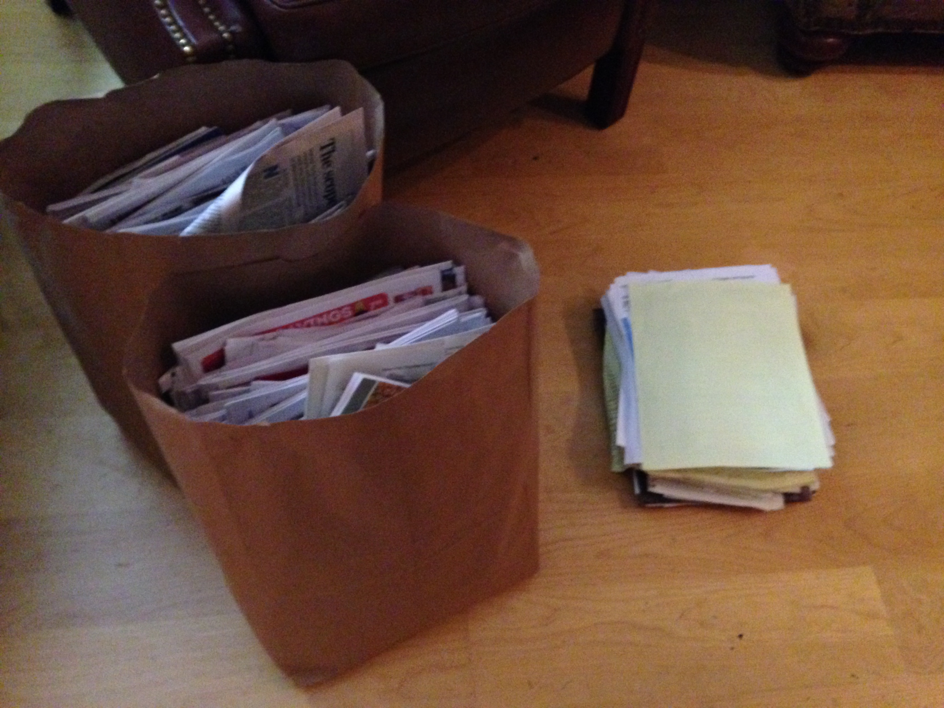 Now, down to business. The clump. With all the Fall Festival baking, going away to upstate New York, and the big writing project to fret over, the paper-build-up in our house again reached danger level. My good friend came over to watch The Voice with me last Monday night, so I swooped up all the paper and dumped it in a corner of our oft-beleaguered study. If its walls could speak they would be crying, “Help, I can’t breathe!”