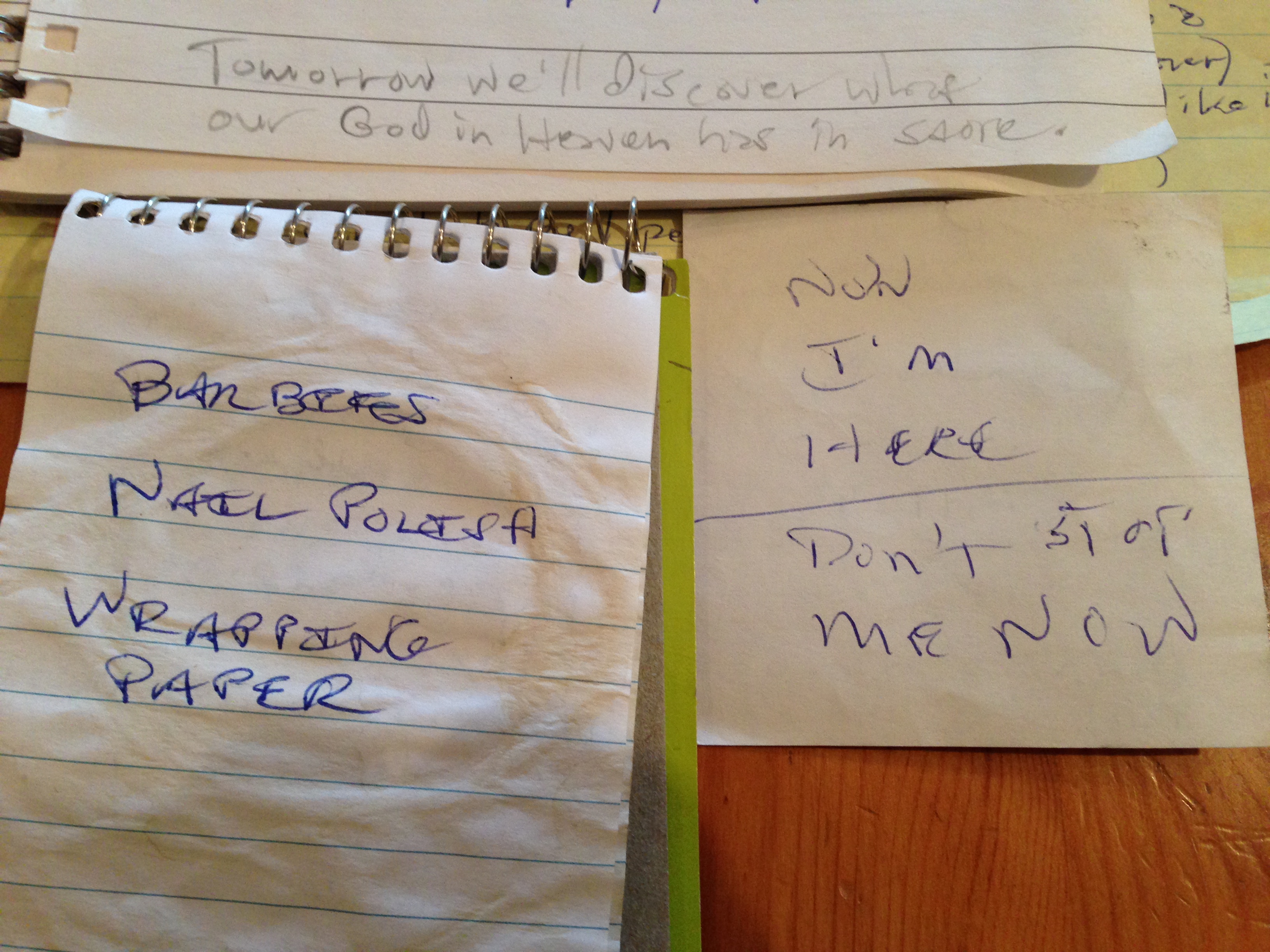 This pile of old notes provided a surprising mash-up of messages.  I was happy to find I had jotted down three things to buy in bulk when on sale this year for a holiday giveaway for the needy: Barbies, nail polish, and wrapping paper, hot items last year.  I must have written “Tomorrow we’ll discover what our God in Heaven has in store” from the song “One Day More” from Les Mis for this blog; the penultimate day of a previous challenge?