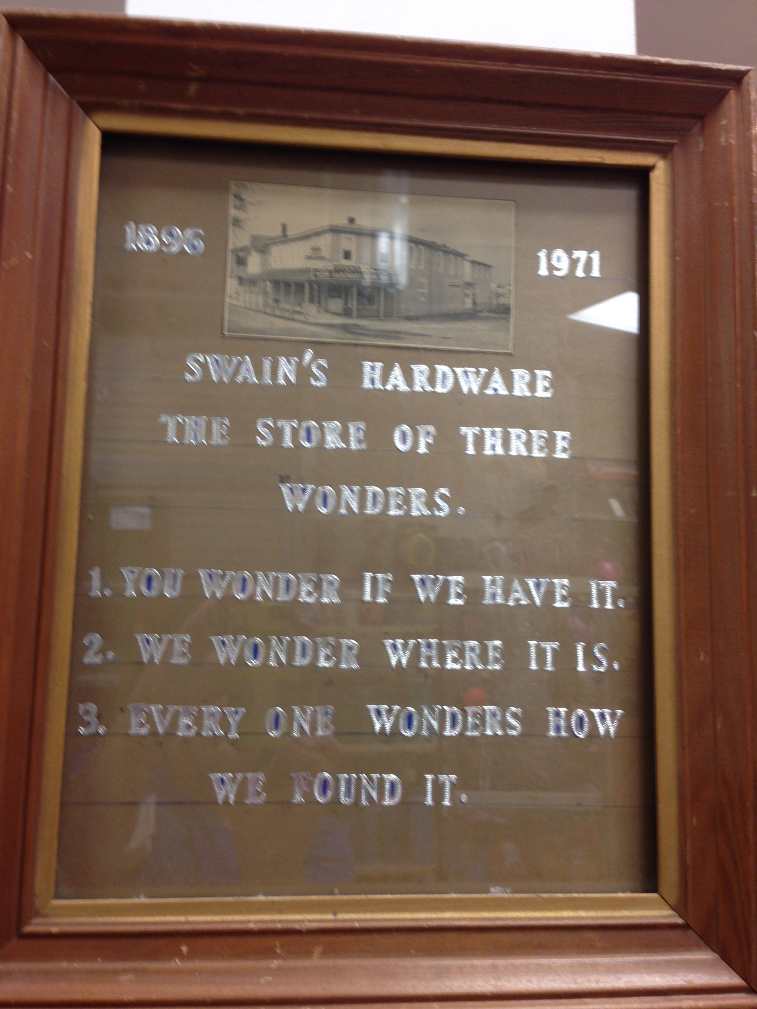 I took this (blurry) photo in a big, rambling hardware store this summer. A store that sells everything. Even when the express purpose of your enterprise is to outfit someone else’s needs, organizing all the stuff is a big challenge.