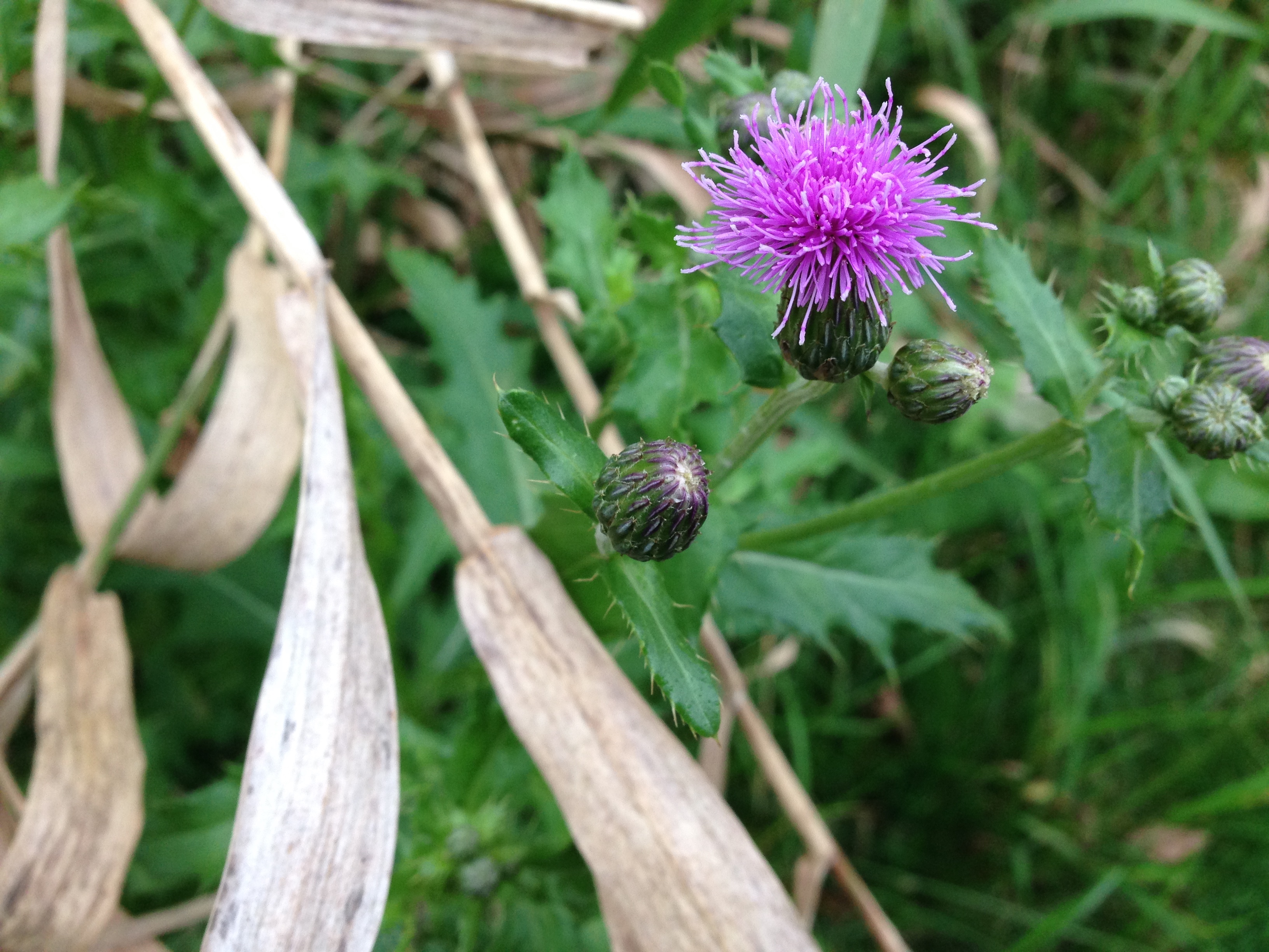 Above, the thistle, thorny bane of most gardeners’ existence.  Pull it up and it roars back tenfold.  Good symbol for today’s job: the clumps I have never been able to eradicate from so many sweeping-ups of other areas in the house.  Somehow they always land in our bedroom, where guests won’t see.  But what does it do to our psyches that the place where my husband and I live and sleep is our dumping ground?