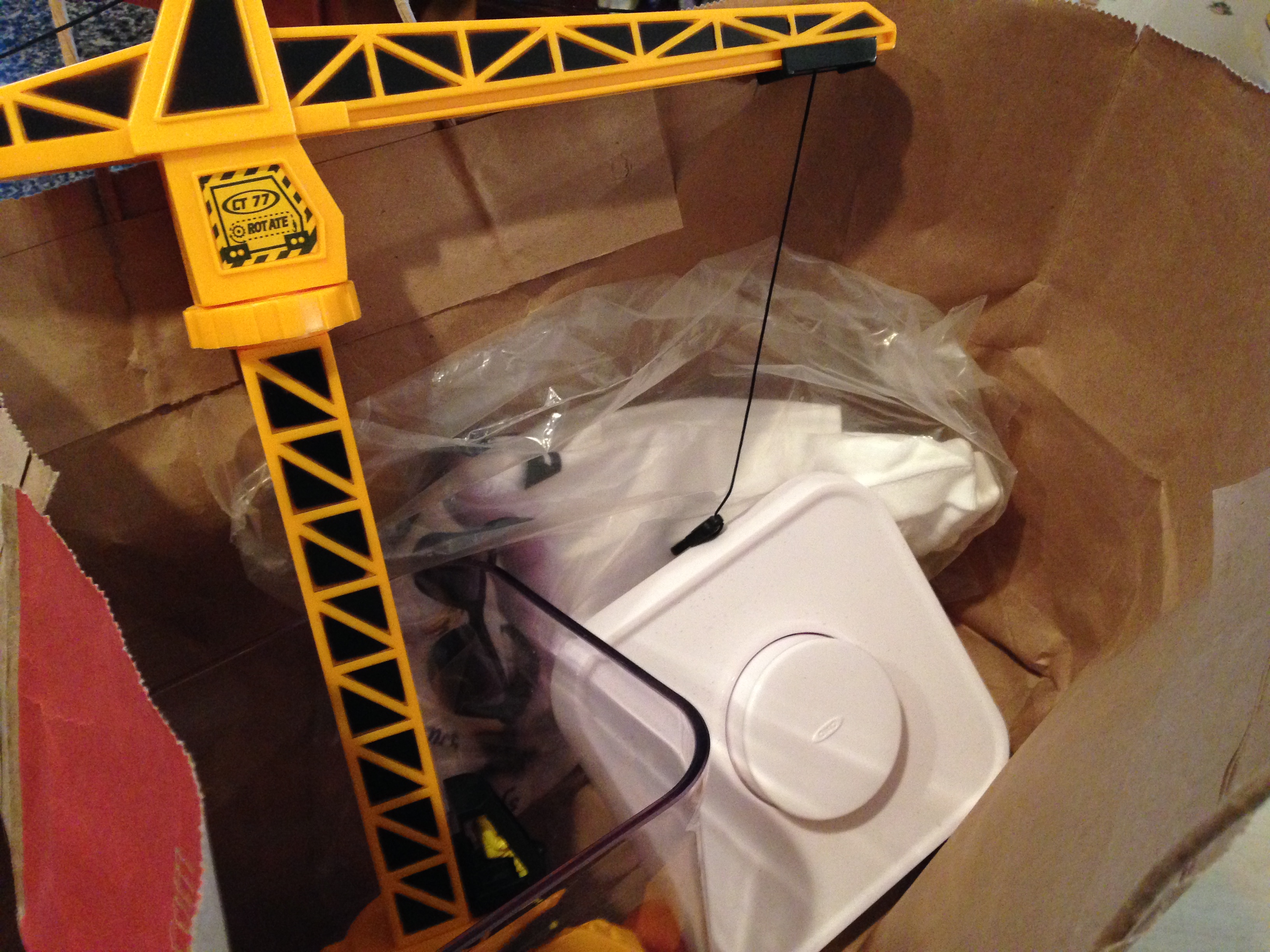 I have to confess that yesterday’s clump was a rough one, not only to do, but also to write about in a way that wasn’t a total bummer. I felt like the pumpkin above. But prying off such long-neglected clumps has given me a new confidence and toughness. How much worse can it get? If I can dispense with ancient girl scout relics, I can handle pretty much anything, including a cute toy crane, below, doing its own heavy lifting. This was part of a donation to Goodwill.