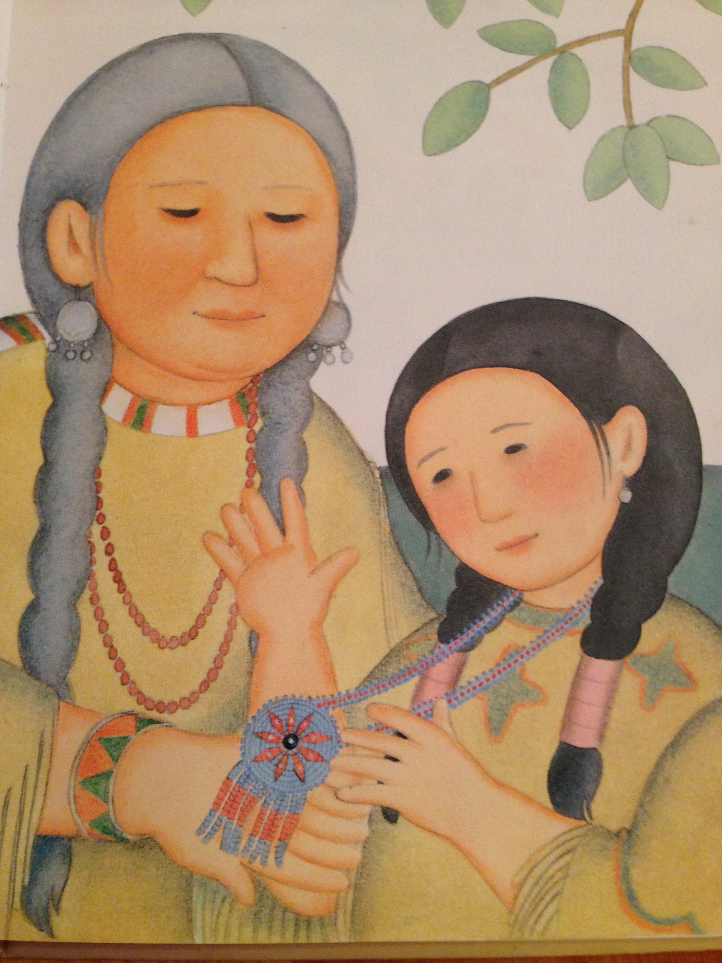 “One day Grandmother Gray Feather presented the child with a beaded necklace that she had made herself. In its center was a little star. ‘Keep this with you always, Little Star,’ she said, ‘and your fondest wish will come true. Just remember to make your wish wisely,’ added Grandmother. ‘Do not waste it, for there may come a day when you will need it.'”