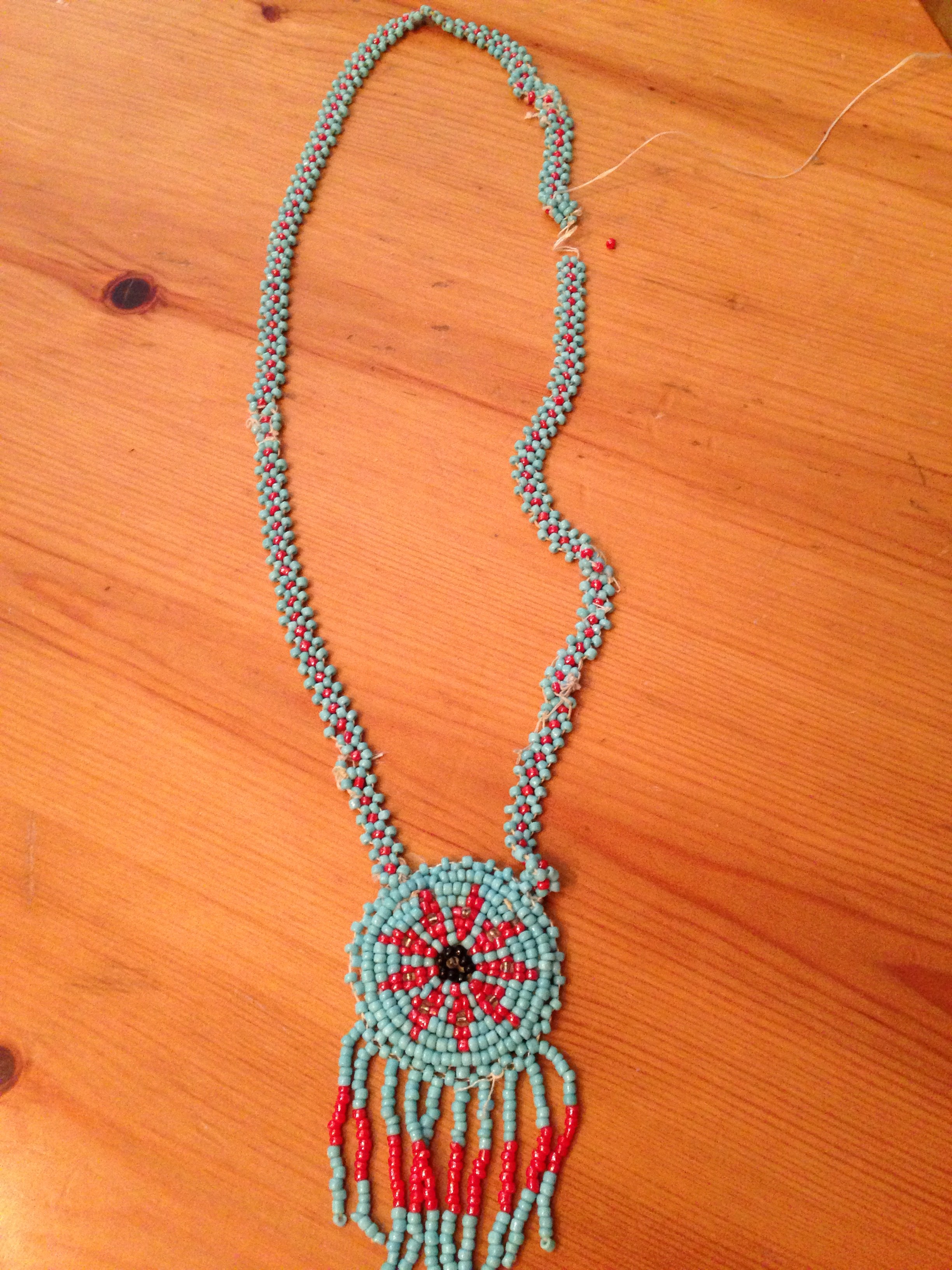 This is one of the many sticky items that I couldn’t dispense with quickly the other day. Do I send up the white flag and throw it out? Every cell in my body resisted that option. Give it to the Goodwill? Possibly, if I could mend it. I opened the envelope, imagining a pile of loose beads, and realized I had been working on it, and I had only needed a few more stitches to make it whole. Why couldn’t I have spared that time when she was little? Ouch!