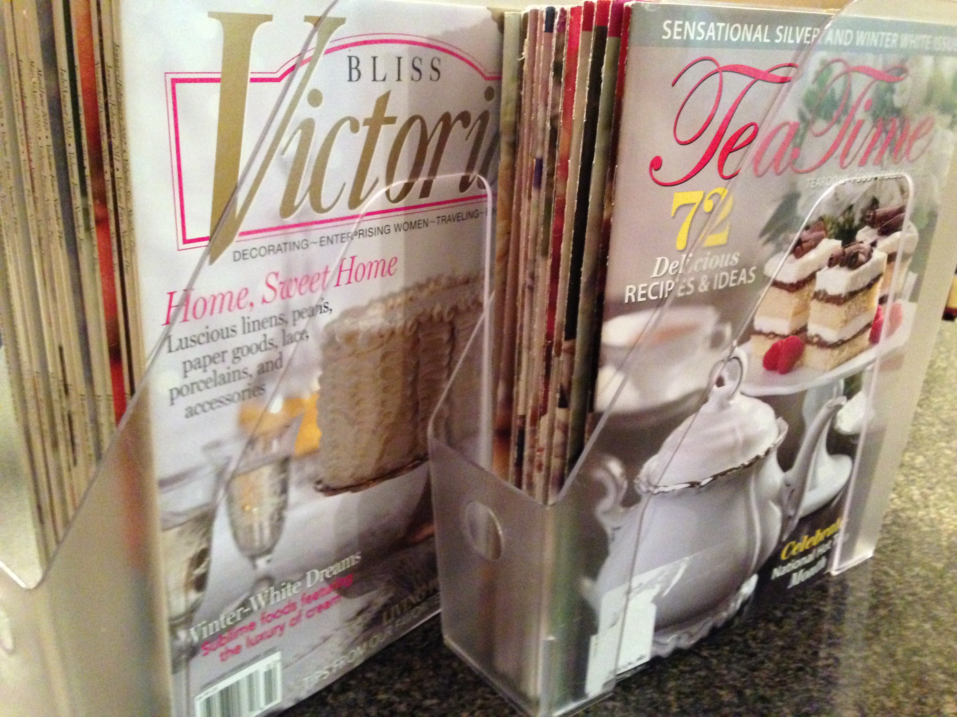 This is a post about finally getting real.  I have collected some very pretty magazines in the two holders below.  They have been taking up space in our bedroom, but today I had to ask myself honestly, “How many times have I looked back through them, looked up a recipe, or even just enjoyed seeing them sitting there?”  The answer is “Zero.”  These two holders and all their contents are now in the Goodwill pile with my fondest blessing (imagine a royal wave in white gloves).