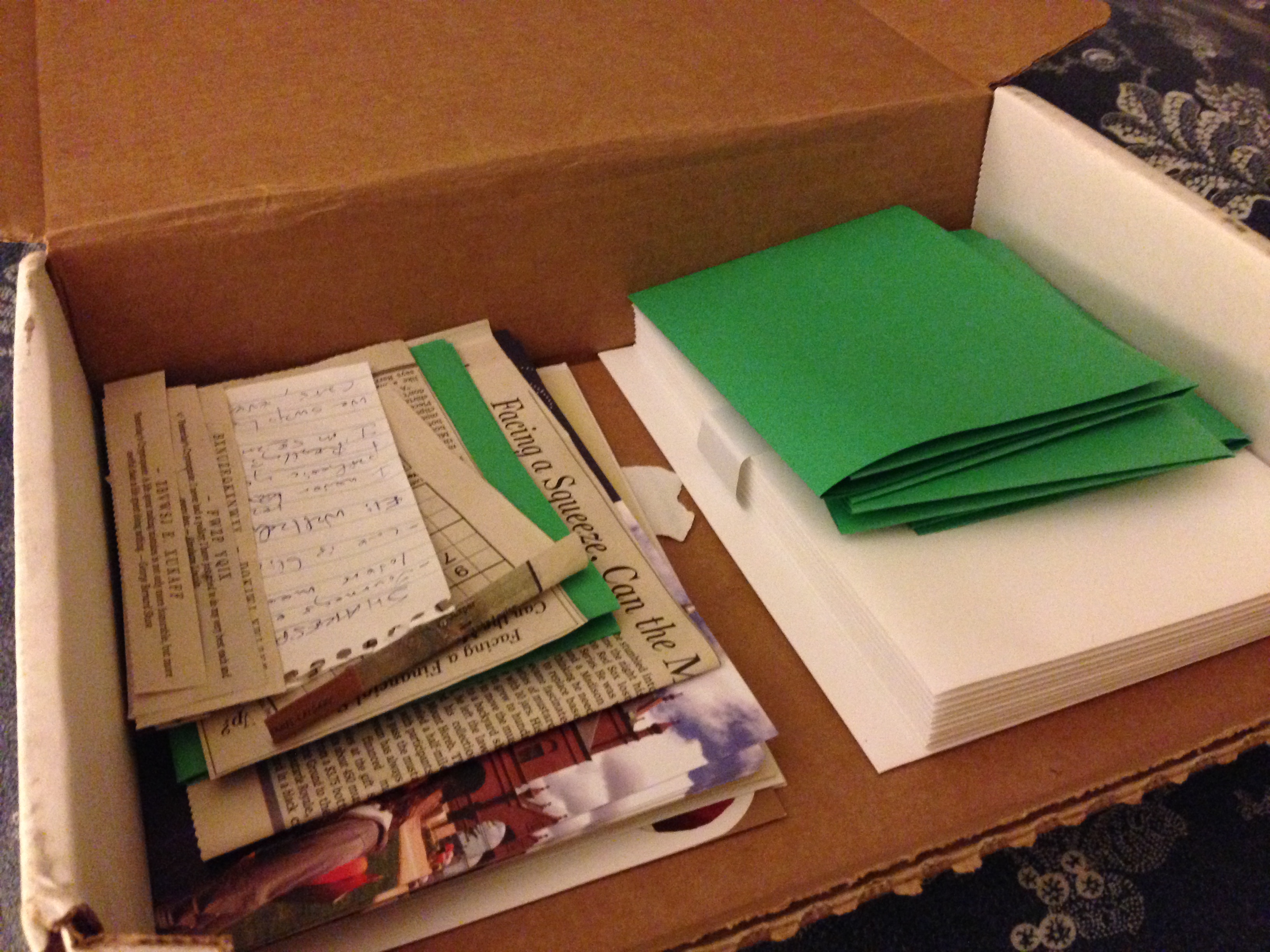 I do want to keep a few cards and letters for posterity. And I can’t throw out good envelopes.  The clippings are another matter.