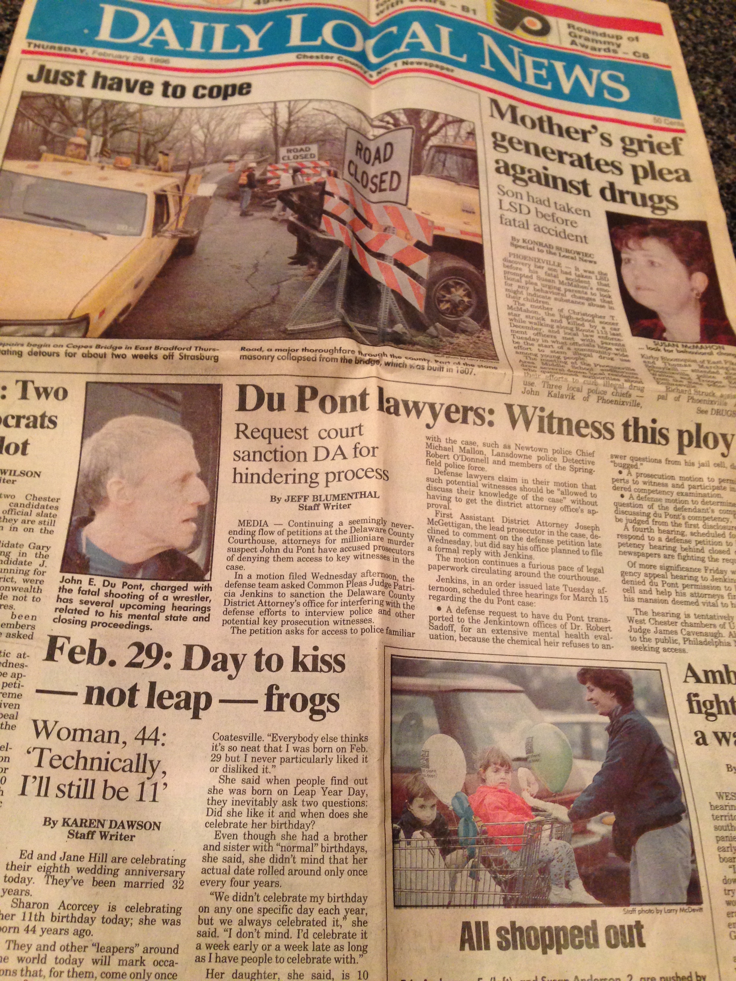 At the time, I remember thinking, ‘Well, here is my fifteen minutes of fame: pushing a shopping cart with cranky kids in it.’  But then I looked up at the story I shared the page with, about John Du Pont (the subject of the movie Foxcatcher, which opened this weekend), and thought, ‘You know what, there are a lot worse fifteen minutes of fame.  I’ll take it.’ Is it a coincidence that the grocery store is now closed?