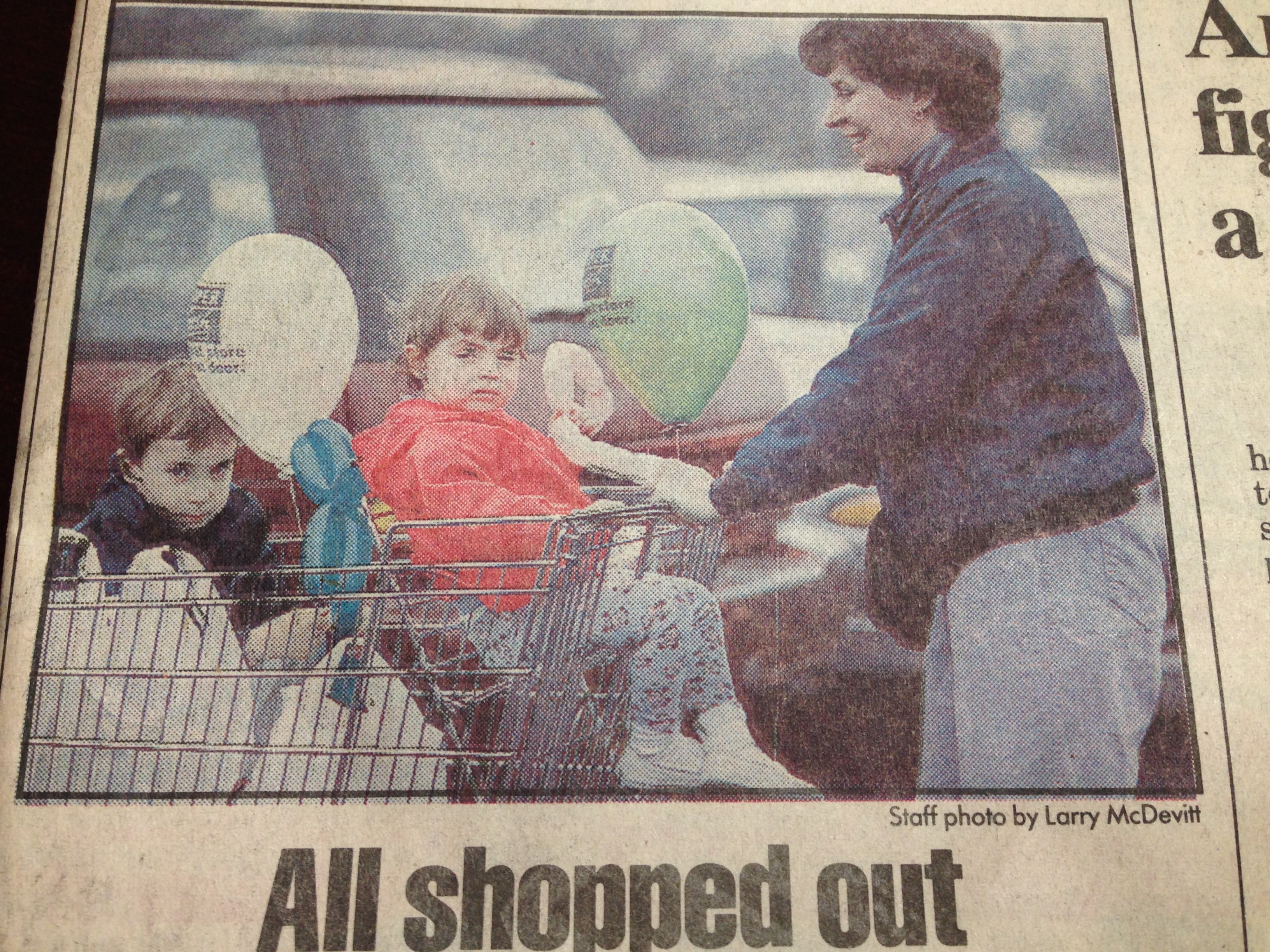 Long, long ago, our son and younger daughter were left at home by their older sister who was going to school.  Such sour moods that morning!  I thought I had a great idea to break the funk, and said, “Hey, there’s a new grocery store opening.  Let’s go shopping there and check out the festivities!”  Well, I’m sure the store managers were hoping to get an upbeat photo of the ribbon-cutting, or some other such good PR photo-op.  Instead, the photo that was put on the front page of the Daily Local was of self-conscious me in mom-jeans and my two still-sour-faced kids above the caption, “All Shopped Out.”  No amount of balloons could lift their spirits.