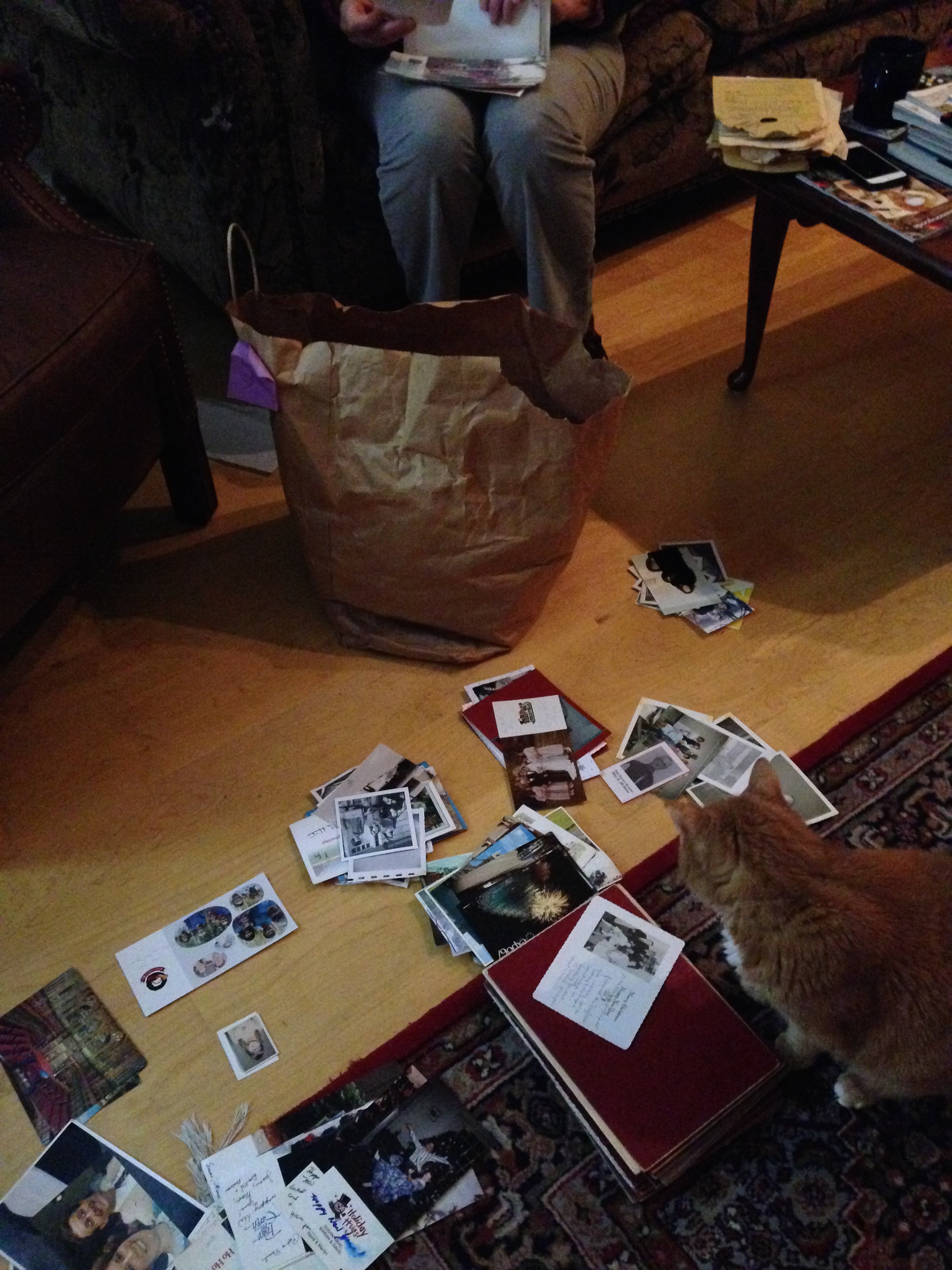 Now I have an idea of how to continue organizing the pictures on my own, so we can finish the job when we’re together again at Christmastime. My Christmas wish! And look, our own slightly grumpy cat gave her begrudging approval, before trying to bat them around.