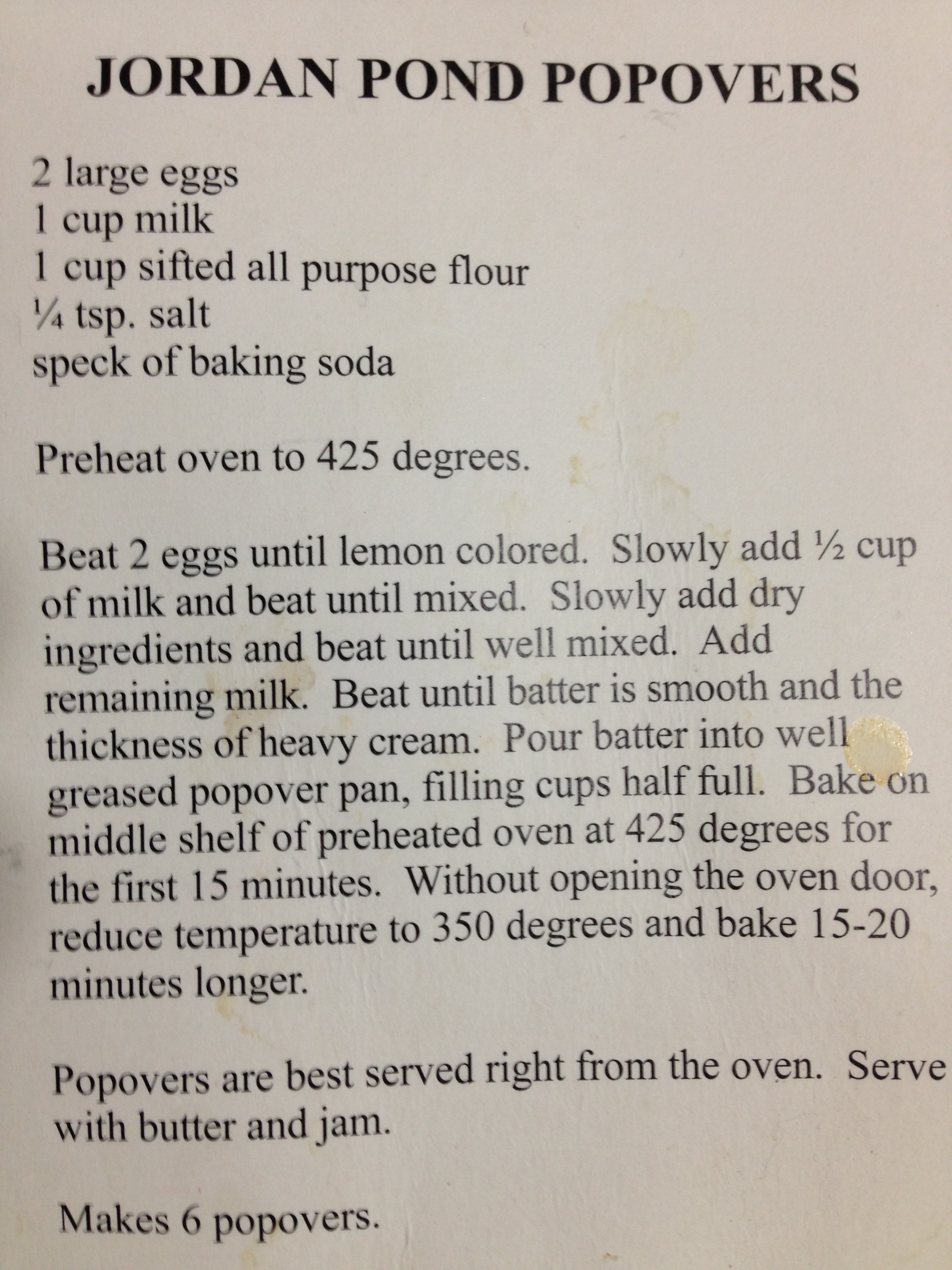 Popovers!  I finally made them this morning.  My husband, my older sister, her daughter, and I vacationed in Maine a few years ago and had lunch at the Jordan Pond House Restaurant at Acadia National Park. The restaurant is known for their popovers.  You end up going crazy for them (Why doesn’t every restaurant in the world serve popovers?).