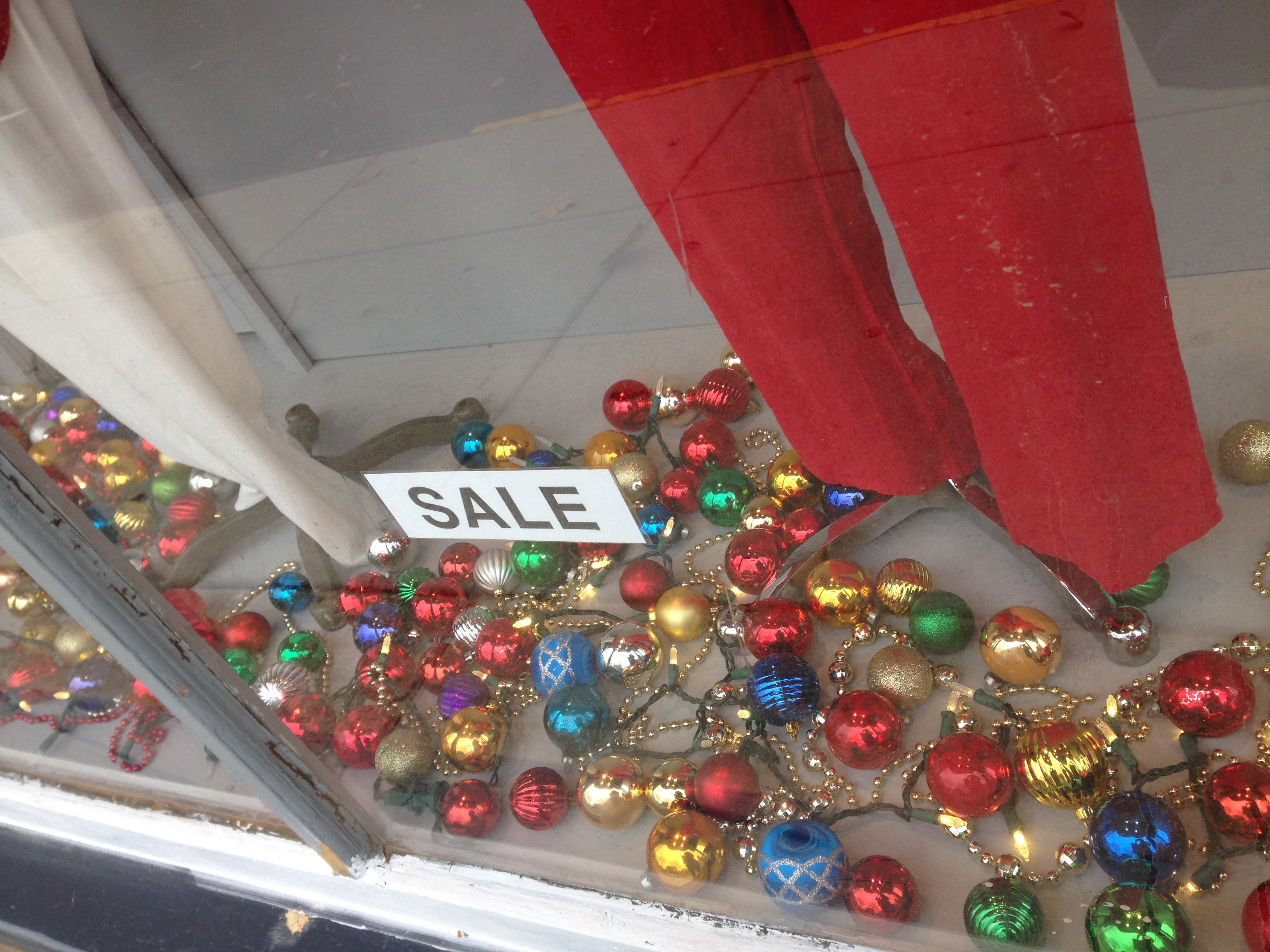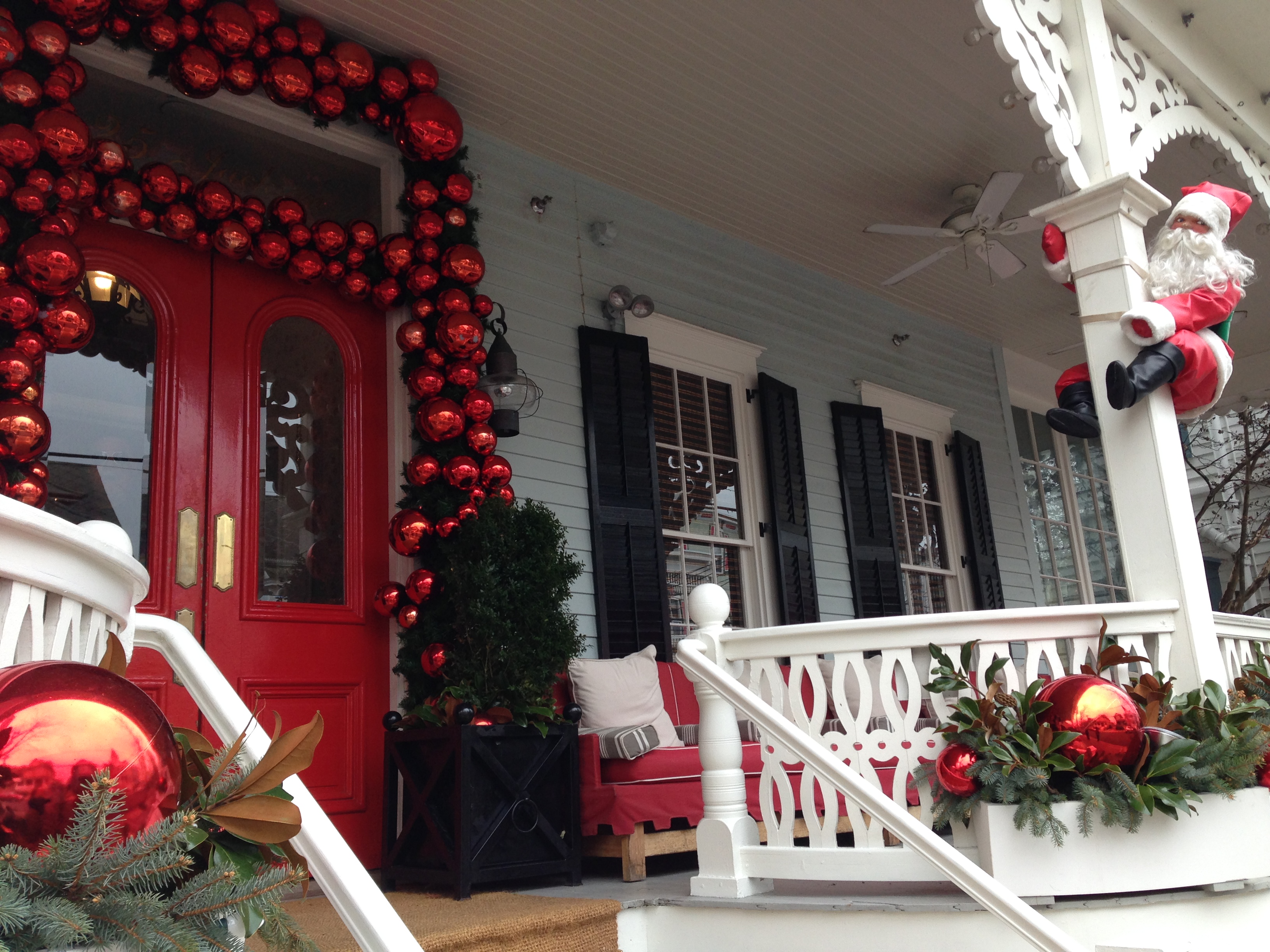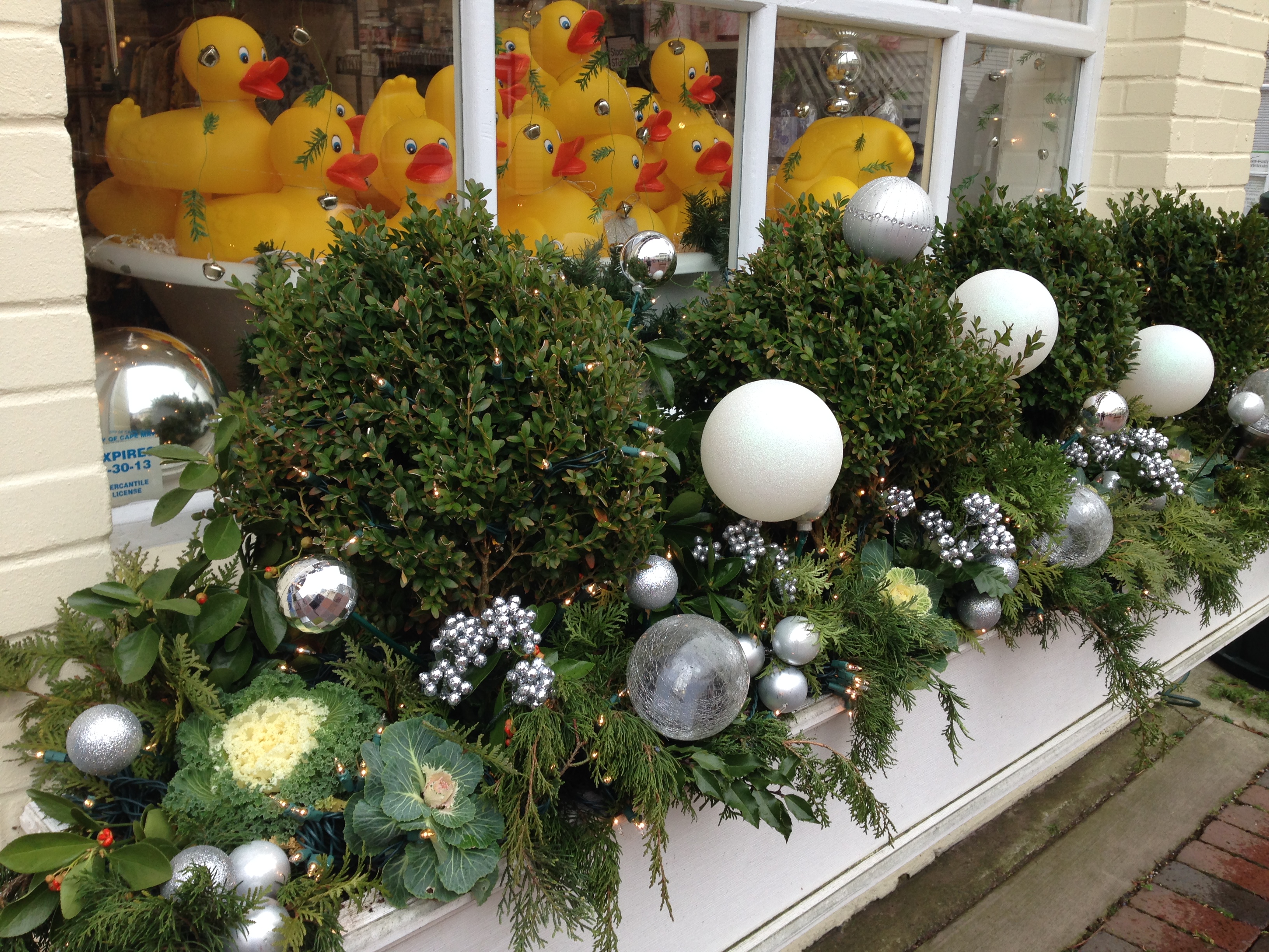 Today I conquered a clump that usually gets put off to the point of painfulness. I purchased gifts for several great people who work with my husband. I turned it into a very pleasant activity by buying the gifts while on a day trip to Cape May, NJ with my younger sister. We had never seen the town in the holiday season before. The photo above was taken at The Virginia Hotel, an elegant establishment and one of the lovely examples of Victorian architecture the town is known for. My sister and I noticed that many window boxes around town were adorned with large, shiny ball ornaments. The ones at the bath shop below looked like soap bubbles.