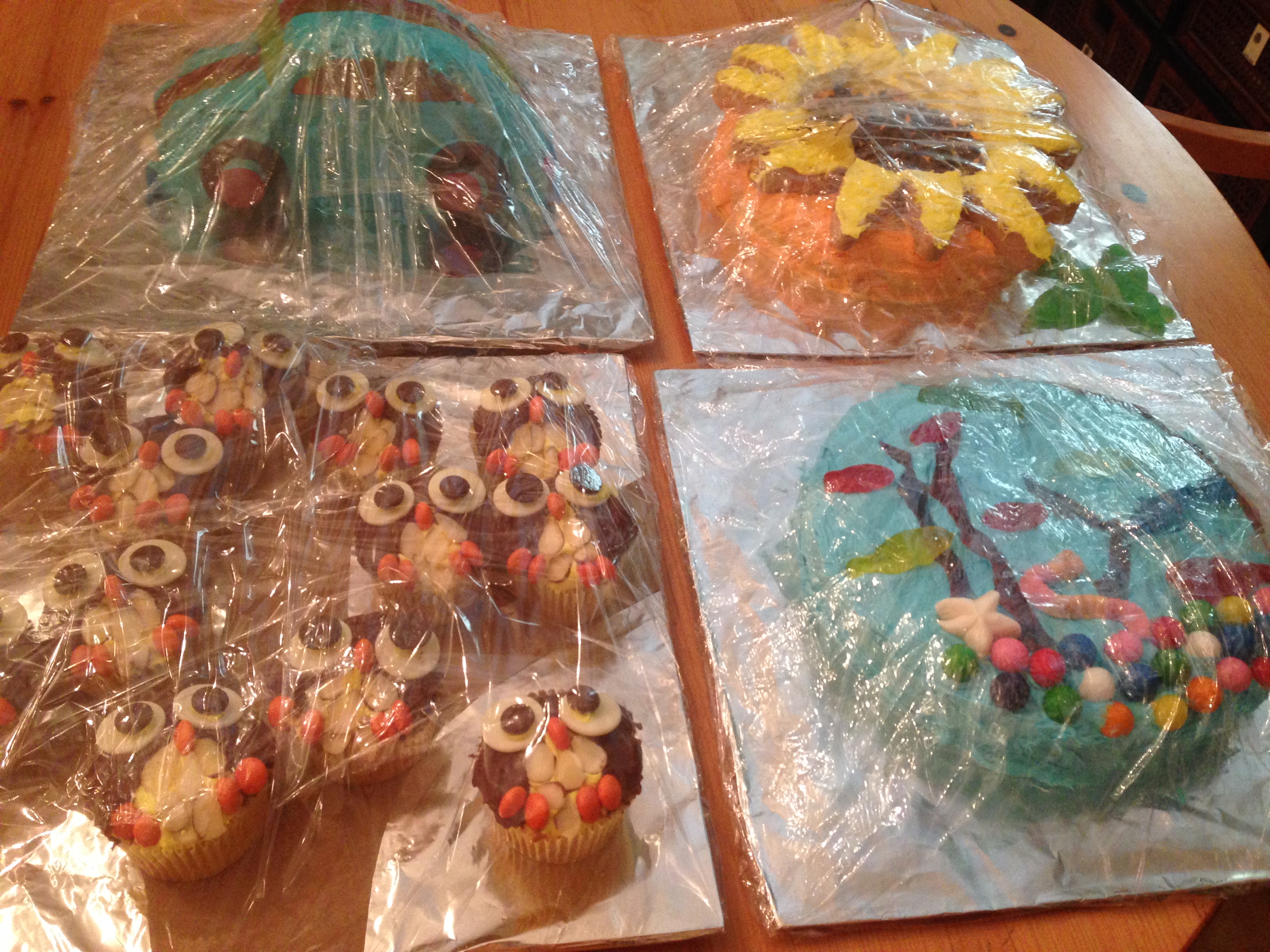 So it all started with the magazine pictured above. A seductive collection of cute cakes that seemed sooo easy and fun. I argued for keeping the Cake Walk in our Quaker Meeting’s Fall Festival — tomorrow — and I said I could throw together four cakes for four walks. For those unfamiliar with the game, a group of kids stand upon carpet squares set in a circle. Underneath each carpet square is written a number. Music plays, the kids move around the circle, ideally dancing. When the music stops, all the players stop. Someone picks a number out of a hat, and whoever is standing on that numbered carpet square wins a cake. Whoo hoo!